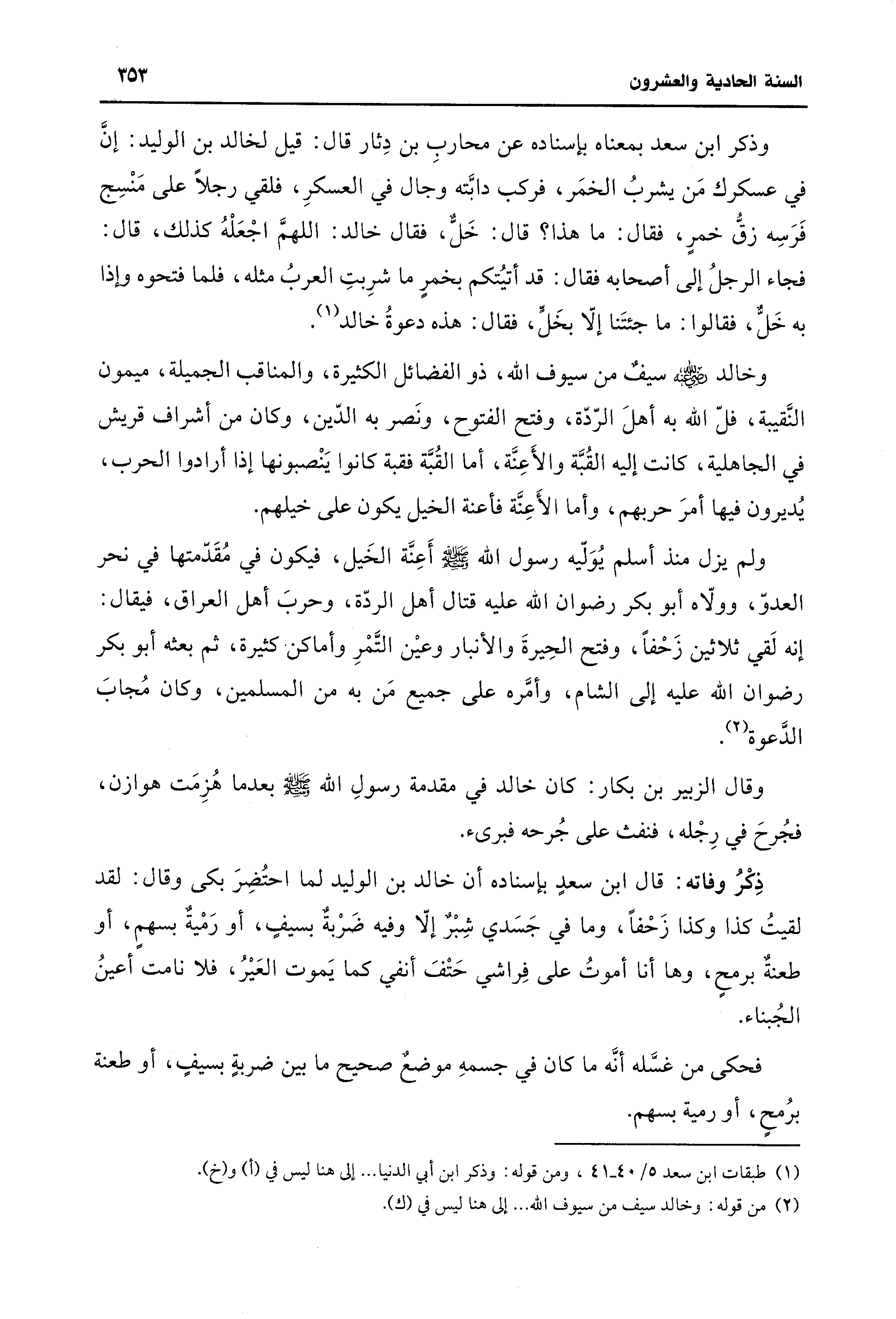 ذِكْرُ وفاته: قال ابن سعدٍ بإسناده أن خالد بن الوليد لما احتُضِرَ بكى وقال: لقد لقيتُ كذا وكذا زَحْفًا، وما في جَسَدي شِبْرٌ إلّا وفيه ضَرْبةٌ بسيفٍ، أو رَمْيةٌ بسهمٍ، أو طعنةٌ برمحٍ، وها أنا أموتُ على فِراشي حَتْفَ أنفي كما يَموت العَيْرُ، فلا نامت أعينُ الجُبناء.