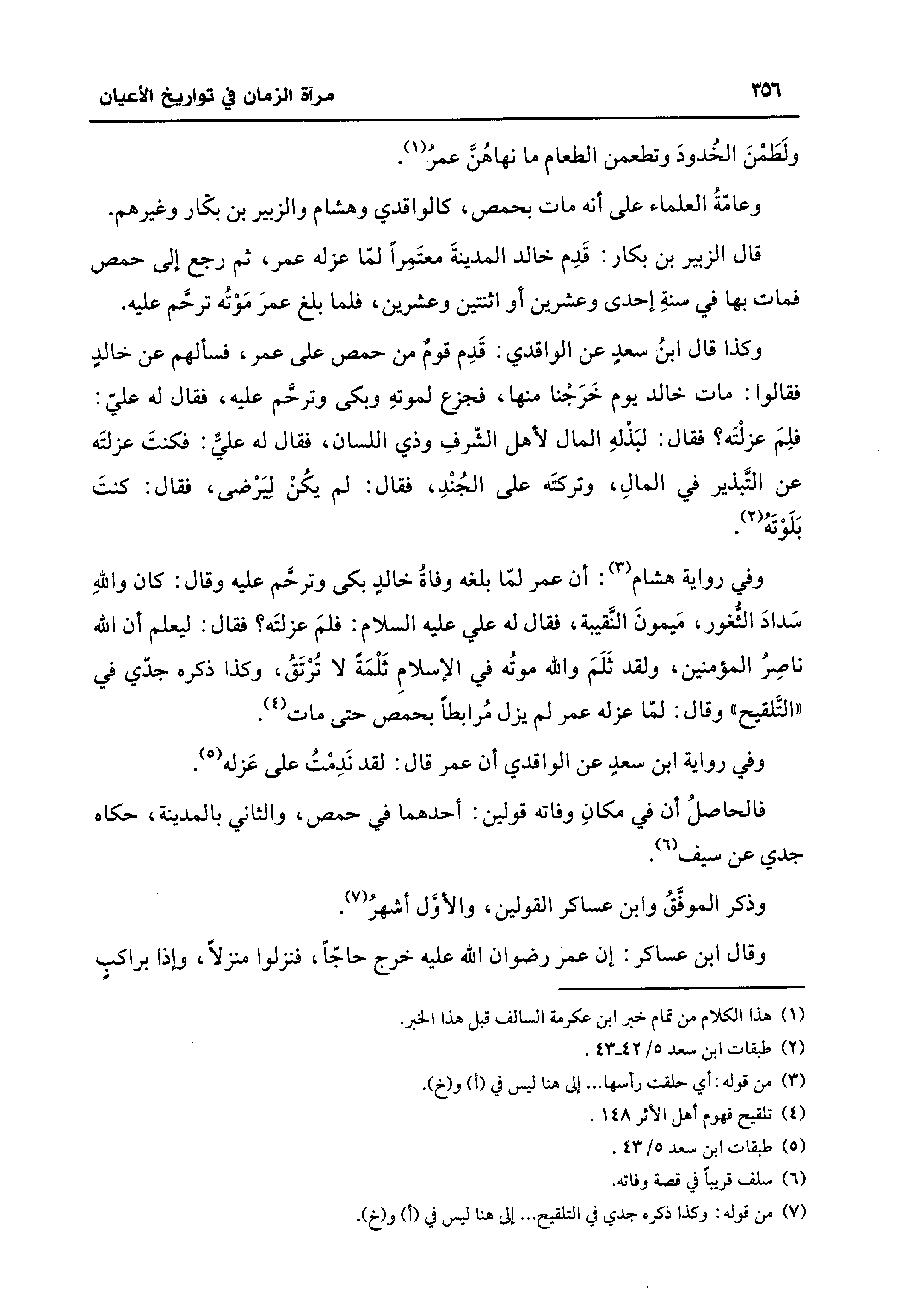 وكذا قال ابنُ سعدٍ عن الواقدي: قَدِم قومٌ من حمص على عمر، فسألهم عن خالدٍ فقالوا: مات خالد يوم خَرَجْنا منها، فجزع لموتهِ وبكى وترحَّم عليه، فقال له عليّ: فلِمَ عزلْتَه؟ فقال: لبَذْلهِ المال لأهل الشّرفِ وذي اللسان، فقال له عليٌّ: فكنتَ عزلتَه عن التَّبذير في المالِ، وتركتَه على الجُنْدِ، فقال: لم يكُنْ ليَرْضى، فقال: كنتَ بَلَوْتَهُ (¬2).