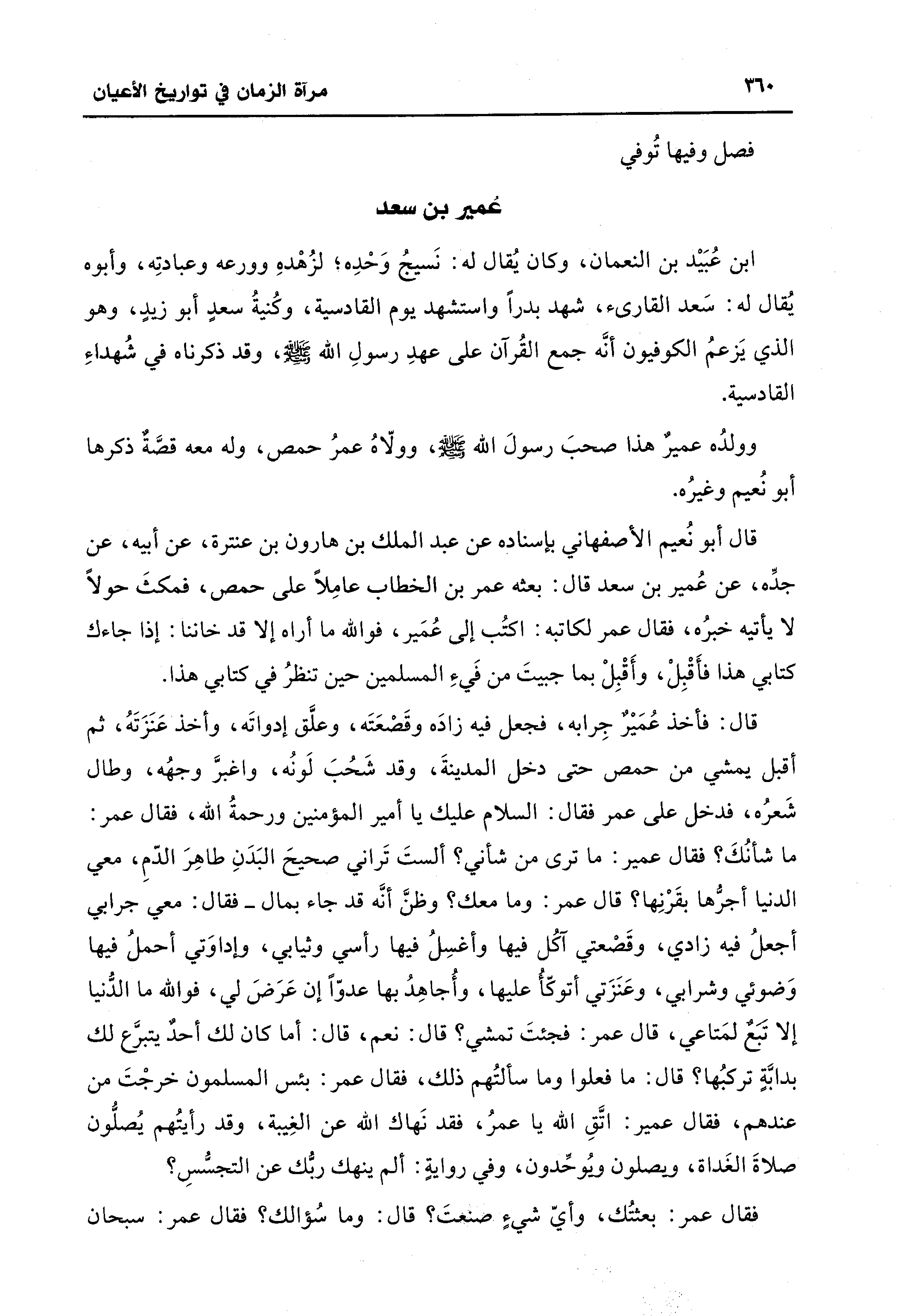 قال: فأخذ عُمَيْرٌ جِرابه، فجعل فيه زادَه وقَصْعَتَه، وعلَّق إدواتَه، وأخذ عَنَزَتَهُ، ثم أقبل يمشي من حمص حتى دخل المدينةَ، وقد شَحُبَ لَونُه، واغبرَّ وجهُه، وطال شَعرُه، فدخل على عمر فقال: السلام عليك يا أمير المؤمنين ورحمةُ اللَّه، فقال عمر: ما شأنُكَ؟ فقال عمير: ما ترى من شأني؟ ألستَ تَراني صحيحَ البَدَنِ طاهِرَ الدّمِ، معي الدنيا أجرُّها بقَرْنِها؟ قال عمر: وما معك؟ وظنَّ أنَّه قد جاء بمال -فقال: معي جرابي أجعلُ فيه زادي، وقَصْعتي آكُل فيها وأغسِلُ فيها رأسي وثيابي، وإداوَتي أحملُ فيها وَضوئي وشرابي، وعَنَزَتي أتوكّأُ عليها، وأُجاهِدُ بها عدوًّا إن عَرَضَ لي، فواللَّه ما الدُّنيا إلا تبَعٌ لمَتاعي، قال عمر: فجئتَ تمشي؟ قال: نعم، قال: أما كان لك أحدٌ يتبرَّع لك بدابَّةٍ تركبُها؟ قال: ما فعلوا وما سألتُهم ذلك، فقال عمر: بئس المسلمون خرجْتَ من عندهم، فقال عمير: اتَّقِ اللَّه يا عمرُ، فقد نَهاك اللَّه عن الغِيبة، وقد رأيتُهم يُصلُّون صلاةَ الغَداة، ويصلون ويُوحِّدون، وفي روايةٍ: ألم ينهك ربُّك عن التجسُّسِ؟