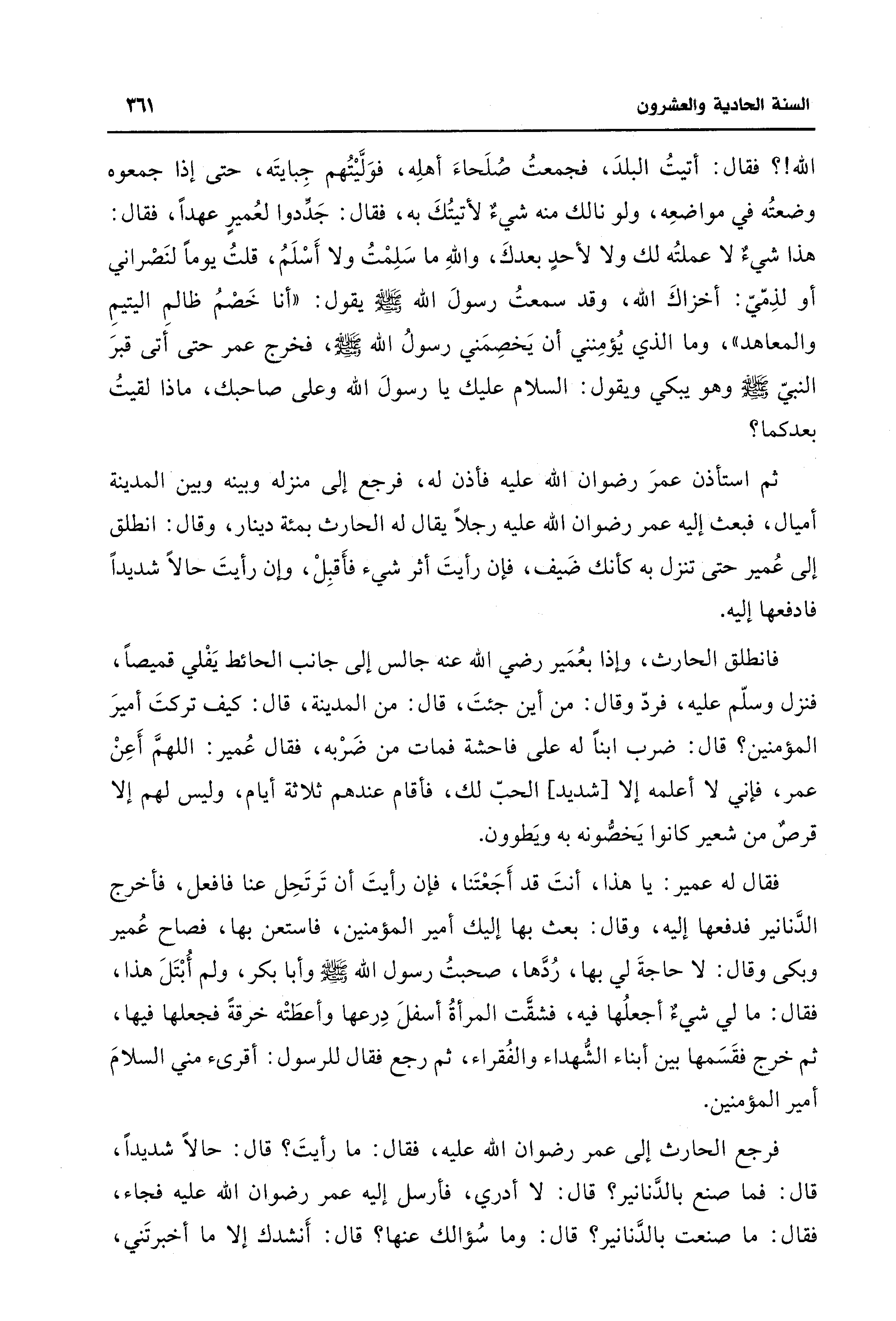 فرجع الحارث إلى عمر رضوان اللَّه عليه، فقال: ما رأيتَ؟ قال: حالًا شديدًا، قال: فما صنع بالدَّنانير؟ قال: لا أدري، فأرسل إليه عمر رضوان اللَّه عليه فجاء، فقال: ما صنعت بالدَّنانير؟ قال: وما سُؤالك عنها؟ قال: أَنشدك إلا ما أخبرتَني،