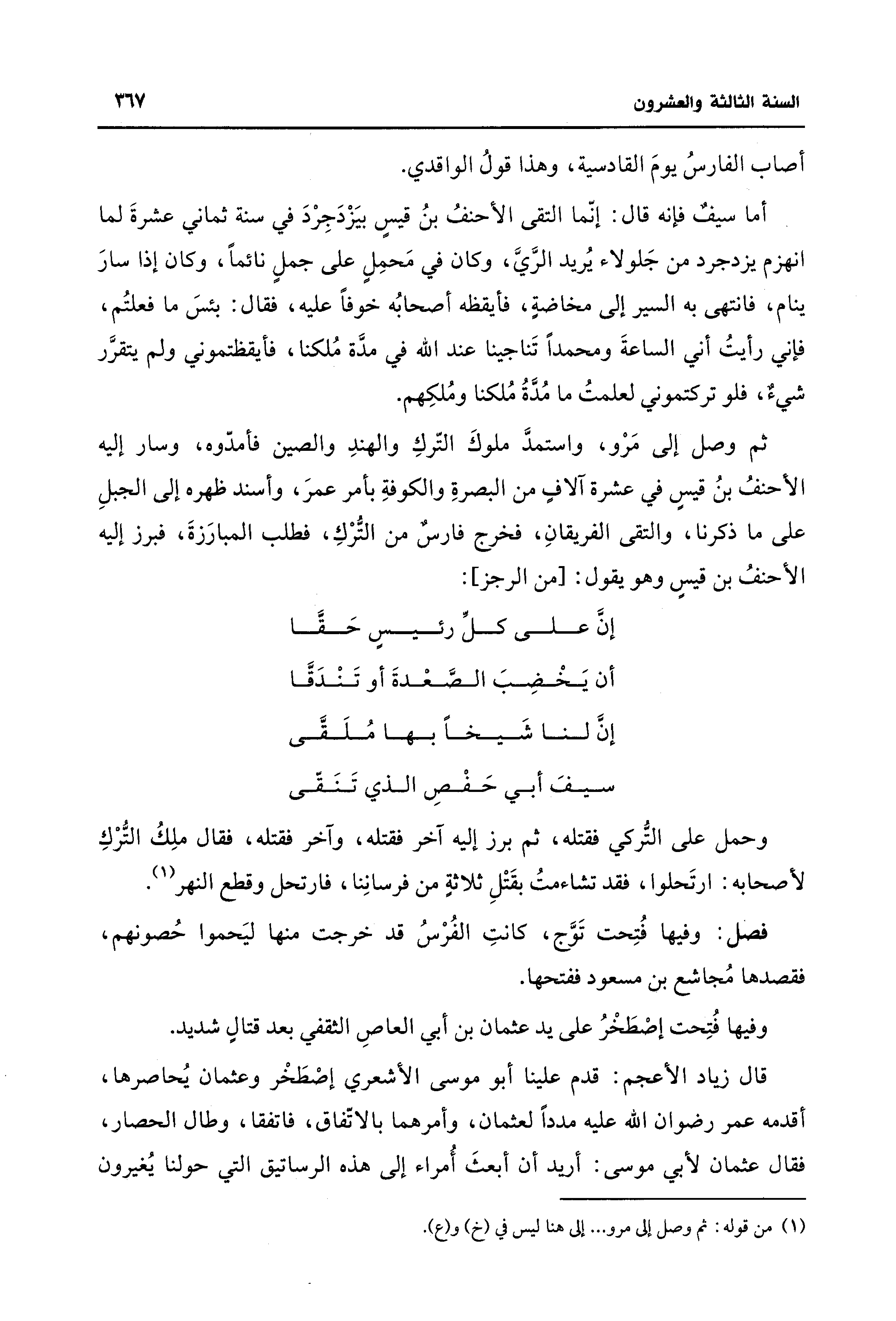 ثم وصل إلى مَرْو، واستمدَّ ملوكَ التّركِ والهندِ والصين فأمدّوه، وسار إليه الأحنفُ بنُ قيسٍ في عشرة آلافٍ من البصرةِ والكوفةِ بأمر عمرَ، وأسند ظهره إلى الجبلِ على ما ذكرنا، والتقى الفريقانِ، فخرج فارسٌ من التُّرْكِ، فطلب المبارَزةَ، فبرز إليه الأحنفُ بن قيسٍ وهو يقول: [من الرجز]: