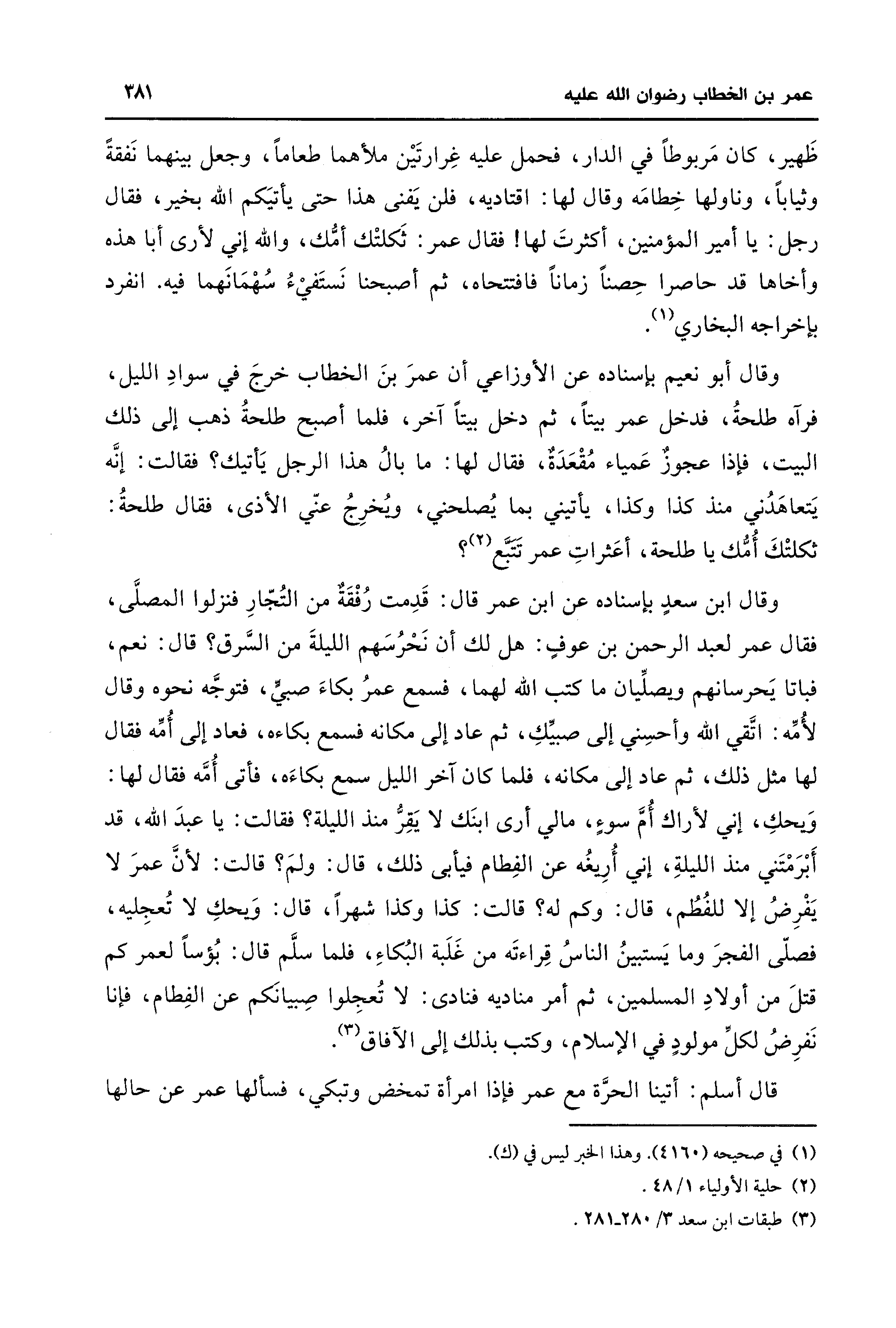 وقال أبو نعيم بإسناده عن الأوزاعي أن عمرَ بنَ الخطاب خرجَ في سوادِ الليل، فرآه طلحةُ، فدخل عمر بيتًا، ثم دخل بيتًا آخر، فلما أصبح طلحةُ ذهب إلى ذلك البيت، فإذا عجوزٌ عَمياء مُقْعَدَةٌ، فقال لها: ما بالُ هذا الرجل يَأتيك؟ فقالت: إنَّه يَتعاهَدُني منذ كذا وكذا، يأتيني بما يُصلحني، ويُخرِجُ عنّي الأذى، فقال طلحةُ: ثكلتْكَ أُمُّك يا طلحة، أعَثراتِ عمر تَتبَّع (¬2)؟