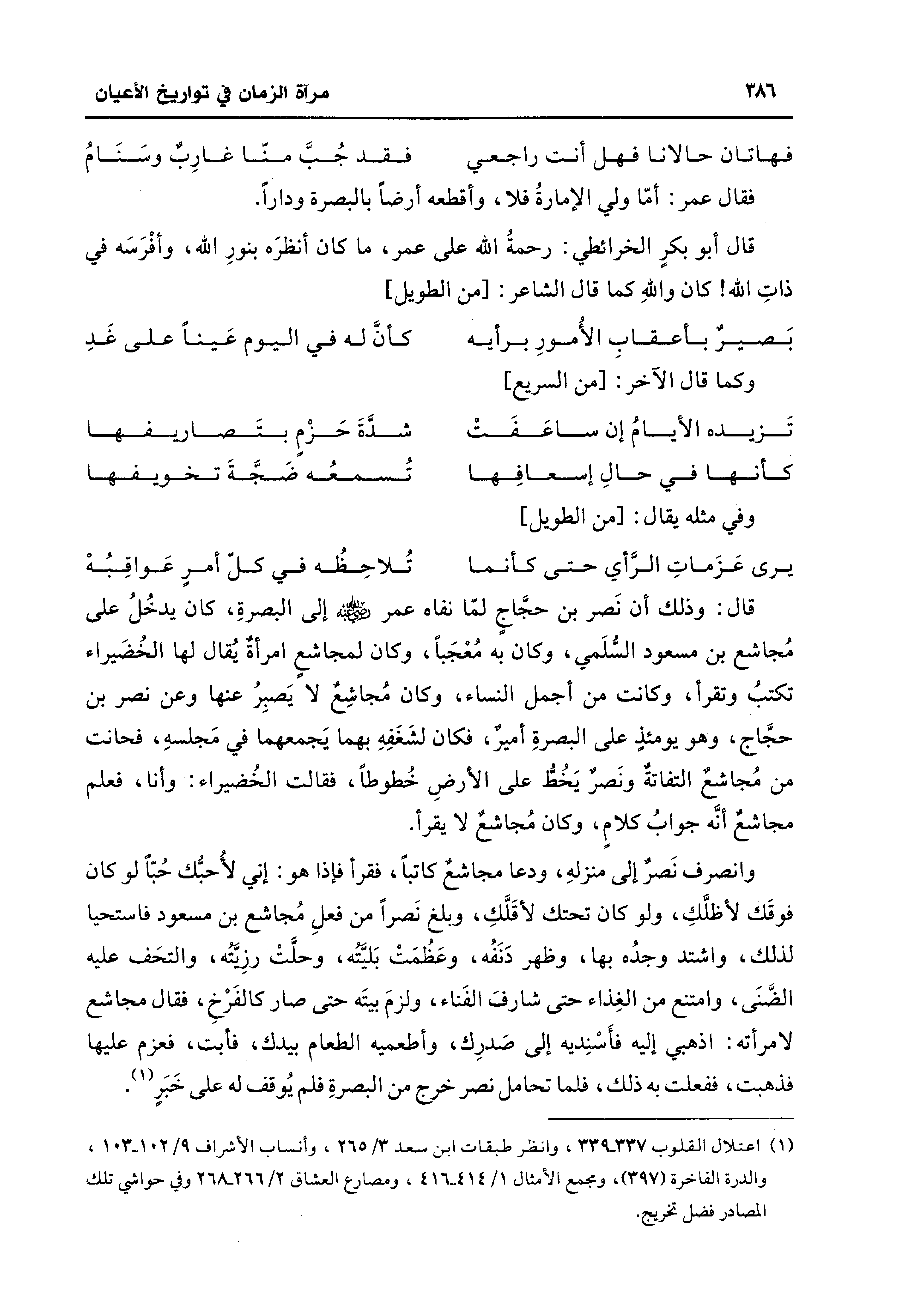 وانصرف نَصرٌ إلى منزلهِ، ودعا مجاشعٌ كاتبًا، فقرأ فإذا هو: إني لأُحبُّك حُبًّا لو كان فوقَك لأظلَّكِ، ولو كان تحتك لأقَلَّكِ، وبلغ نَصرًا من فعلِ مُجاشع بن مسعود فاستحيا لذلك، واشتد وجدُه بها، وظهر دَنَفُه، وعَظُمَتْ بَليَّتُه، وحلَّتْ رزِيَّتُه، والتحَف عليه الضَّنَى، وامتنع من الغِذاء حتى شارفَ الفَناء، ولزمَ بيتَه حتى صار كالفَرْخِ، فقال مجاشع لامرأته: اذهبي إليه فأَسْنِديه إلى صَدرِك، وأطعميه الطعام بيدك، فأبت، فعزم عليها فذهبت، ففعلت به ذلك، فلما تحامل نصر خرج من البصرةِ فلم يُوقف له على خَبَرٍ (¬1).