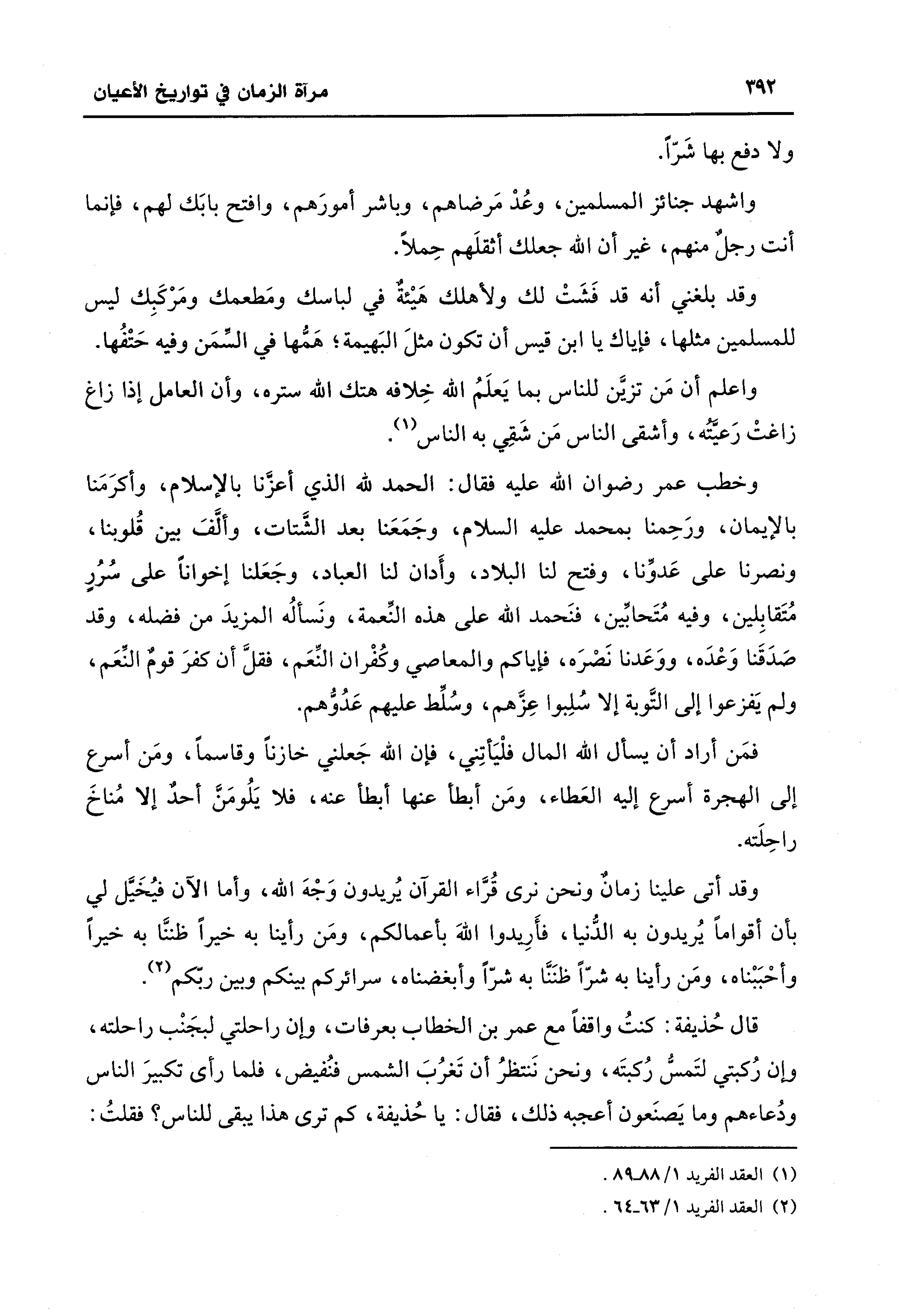 قال حُذيفة: كنتُ واقفًا مع عمر بن الخطاب بعرفات، وإن راحلتي لبجَنْب راحلته، وإن رُكبتي لتَمسُّ رُكبتَه، ونحن نَنتظرُ أن تَغرُبَ الشمس فنُفيض، فلما رأى تكبيرَ الناس ودُعاءهم وما يَصنَعون أعجبه ذلك، فقال: يا حُذيفة، كم ترى هذا يبقى للناس؟ فقلتُ:
