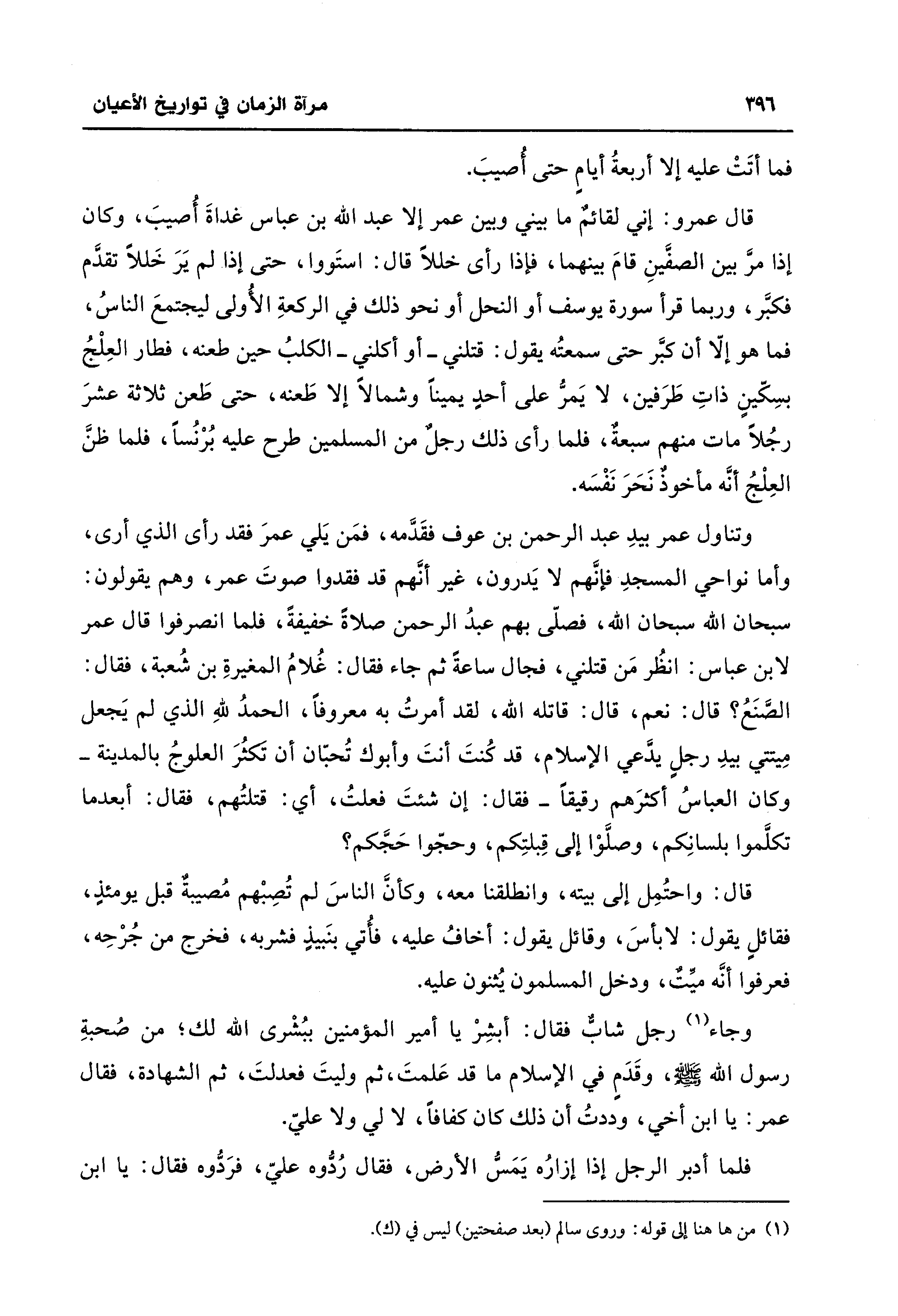 قال عمرو: إني لقائمٌ ما بيني وبين عمر إلا عبد اللَّه بن عباس غداةَ أُصيبَ، وكان إذا مرَّ بين الصفَّينِ قامَ بينهما، فإذا رأى خللًا قال: استَووا، حتى إذا لم يَرَ خَللًا تقدَّم فكبَّر، وربما قرأ سورة يوسف أو النحل أو نحو ذلك في الركعةِ الأُولى ليجتمعَ الناسُ، فما هو إلّا أن كبَّر حتى سمعتُه يقول: قتلني -أو أكلني- الكلبُ حين طعنه، فطار العِلْجُ بسِكّينٍ ذاتِ طَرَفين، لا يَمرُّ على أحدٍ يمينًا وشمالًا إلا طَعنه، حتى طَعن ثلاثة عشرَ رجُلًا مات منهم سبعةٌ، فلما رأى ذلك رجلٌ من المسلمين طرح عليه بُرْنُسًا، فلما ظنَّ العِلْجُ أنَّه مأخوذٌ نَحَرَ نَفْسَه.