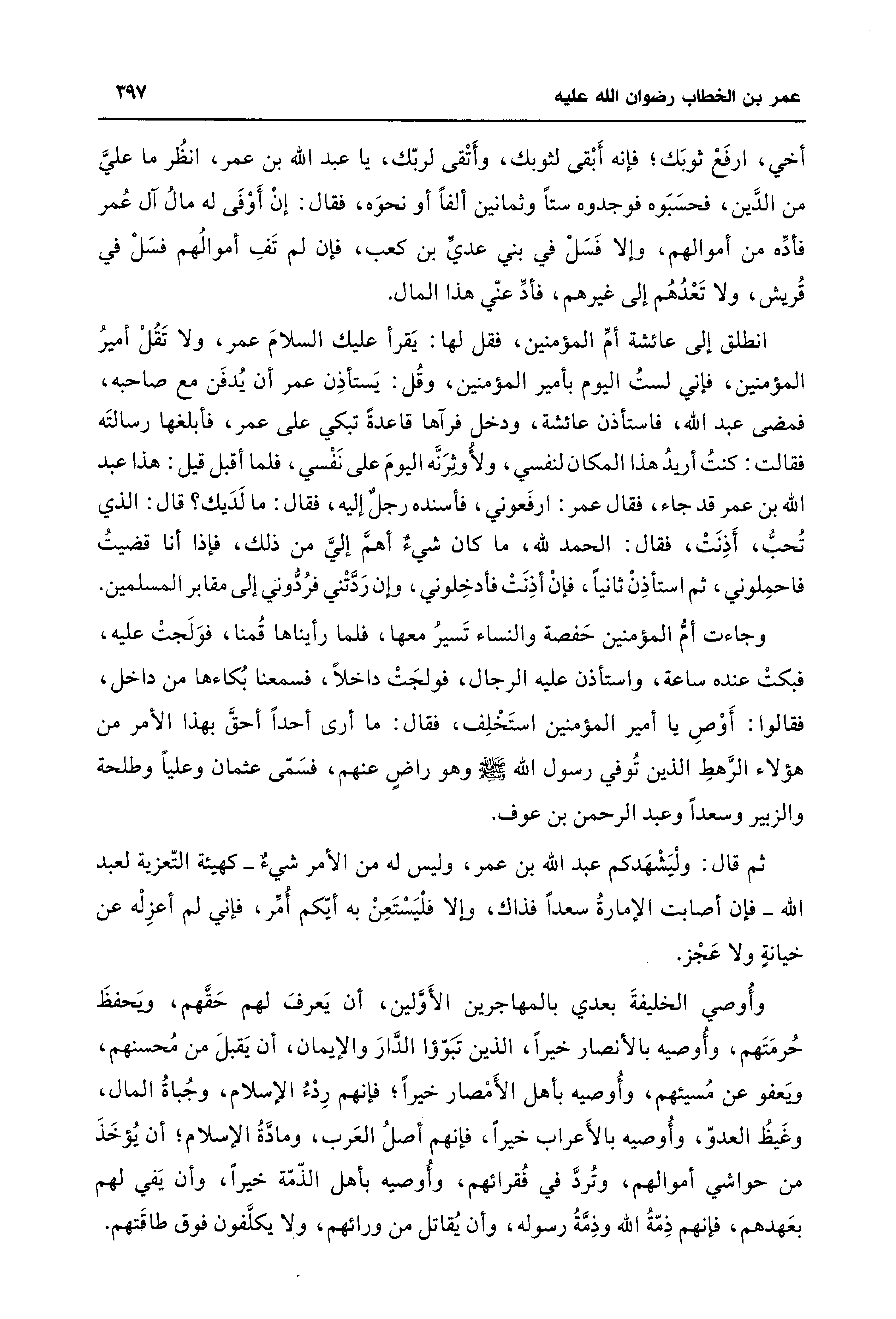 وأُوصي الخليفةَ بعدي بالمهاجرين الأَوَّلين، أن يَعرفَ لهم حَقَّهم، ويَحفظَ حُرمَتَهم، وأُوصيه بالأنصار خيرًا، الذين تبَوّؤا الدَّارَ والإيمان، أن يَقبلَ من مُحسنهم، ويَعفو عن مُسيئهم، وأُوصيه بأهل الأَمْصار خيرًا؛ فإنهم رِدْءُ الإسلام، وجُباةُ المال، وغَيظُ العدوّ، وأُوصيه بالأَعراب خيرًا، فإنهم أصلُ العَرب، ومادَّةُ الإسلام؛ أن يُؤخَذَ من حواشي أموالهم، وتُردَّ في فُقرائهم، وأُوصيه بأهل الذّمّة خيرًا، وأن يَفي لهم بعَهدهم، فإنهم ذِمّةُ اللَّه وذِمَّةُ رسوله، وأن يُقاتل من ورائهم، ولا يكلَّفون فوق طاقَتهم.