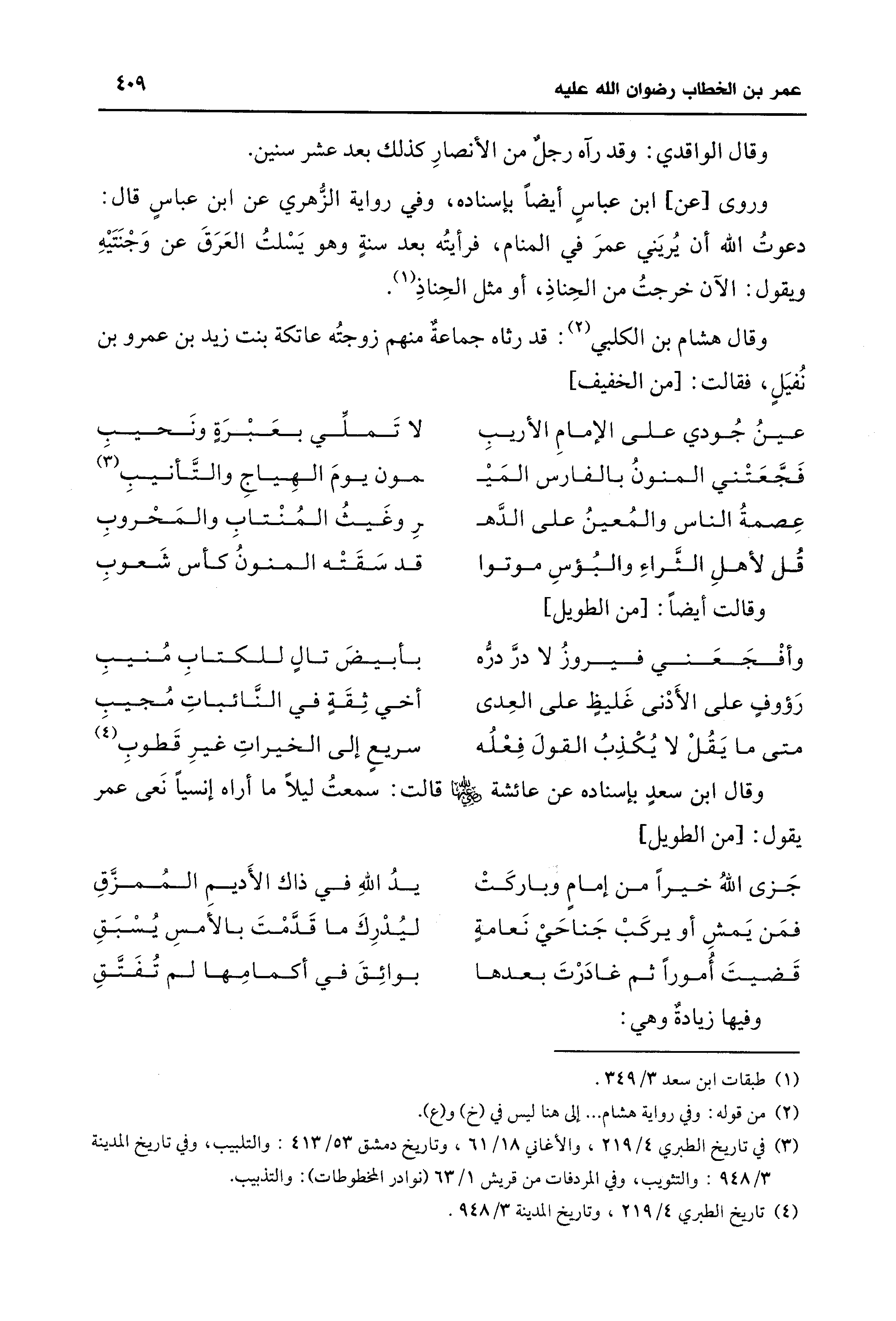وقال ابن سعدٍ بإسناده عن عائشة -رضي اللَّه عنها- قالت: سمعتُ ليلًا ما أراه إنسيًا نَعى عمر يقول: [من الطويل]