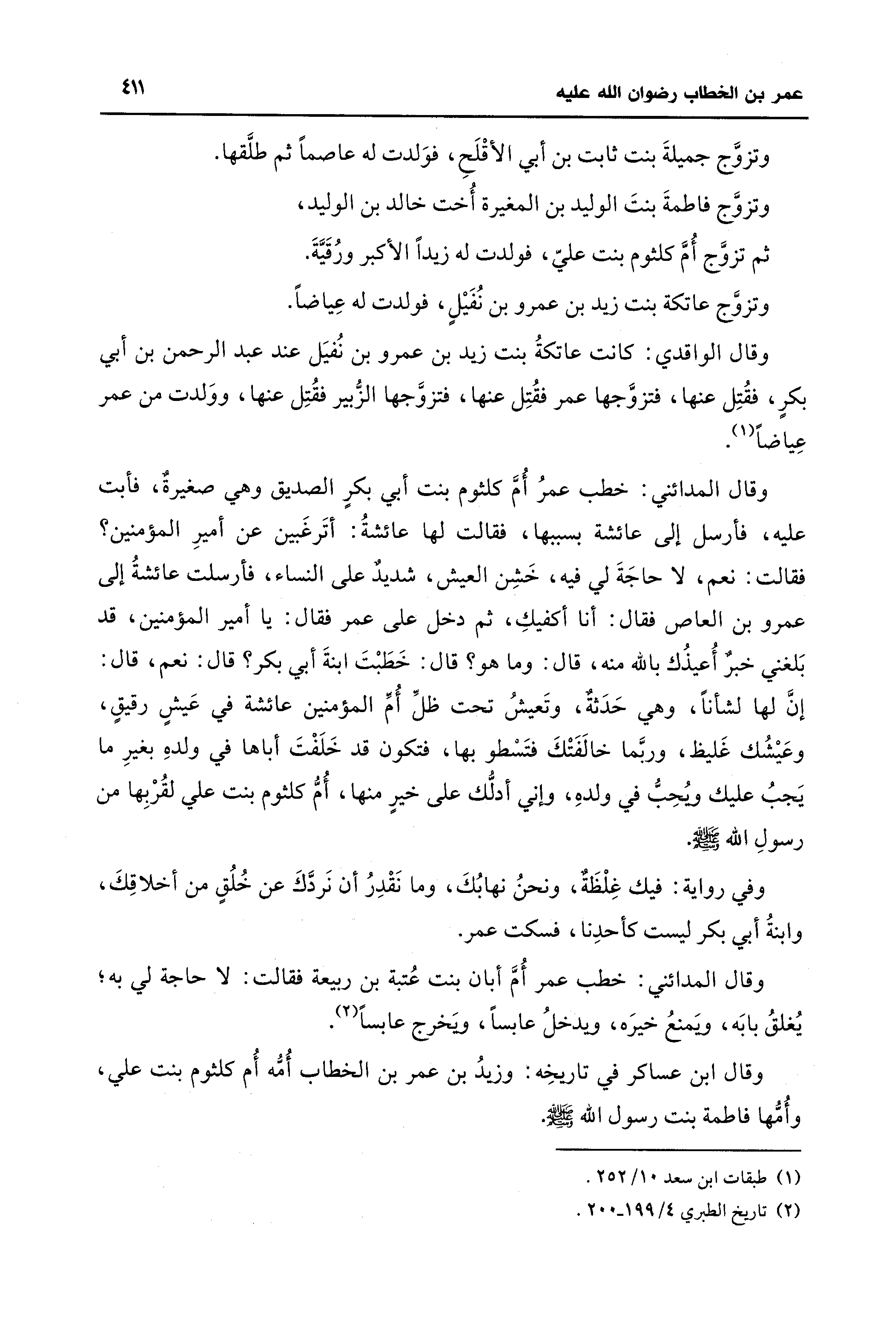 وقال المدائني: خطب عمرُ أُمَّ كلثوم بنت أبي بكرٍ الصديق وهي صغيرةٌ، فأبت عليه، فأرسل إلى عائشة بسببها، فقالت لها عائشةُ: أتَرغَبين عن أميرِ المؤمنين؟ فقالت: نعم، لا حاجَةَ لي فيه، خَشِن العيش، شديدٌ على النساء، فأرسلت عائشةُ إلى عمرو بن العاص فقال: أنا أكفيكِ، ثم دخل على عمر فقال: يا أمير المؤمنين، قد بَلغني خبرٌ أُعيذُك باللَّه منه، قال: وما هو؟ قال: خَطَبْتَ ابنةَ أبي بكر؟ قال: نعم، قال: إنَّ لها لشأنًا، وهي حَدَثةٌ، وتَعيشُ تحت ظلِّ أُمِّ المؤمنين عائشة في عَيشٍ رقيقٍ، وعَيْشُك غَليظ، وربَّما خالَفَتْكَ فتَسْطو بها، فتكون قد خَلَفْتَ أباها في ولدهِ بغيرِ ما يَجبُ عليك ويُحِبُّ في ولدهِ، وإني أدلُّك على خيرٍ منها، أُمُّ كلثوم بنت علي لقُرْبِها من رسولِ اللَّه -صلى اللَّه عليه وسلم-