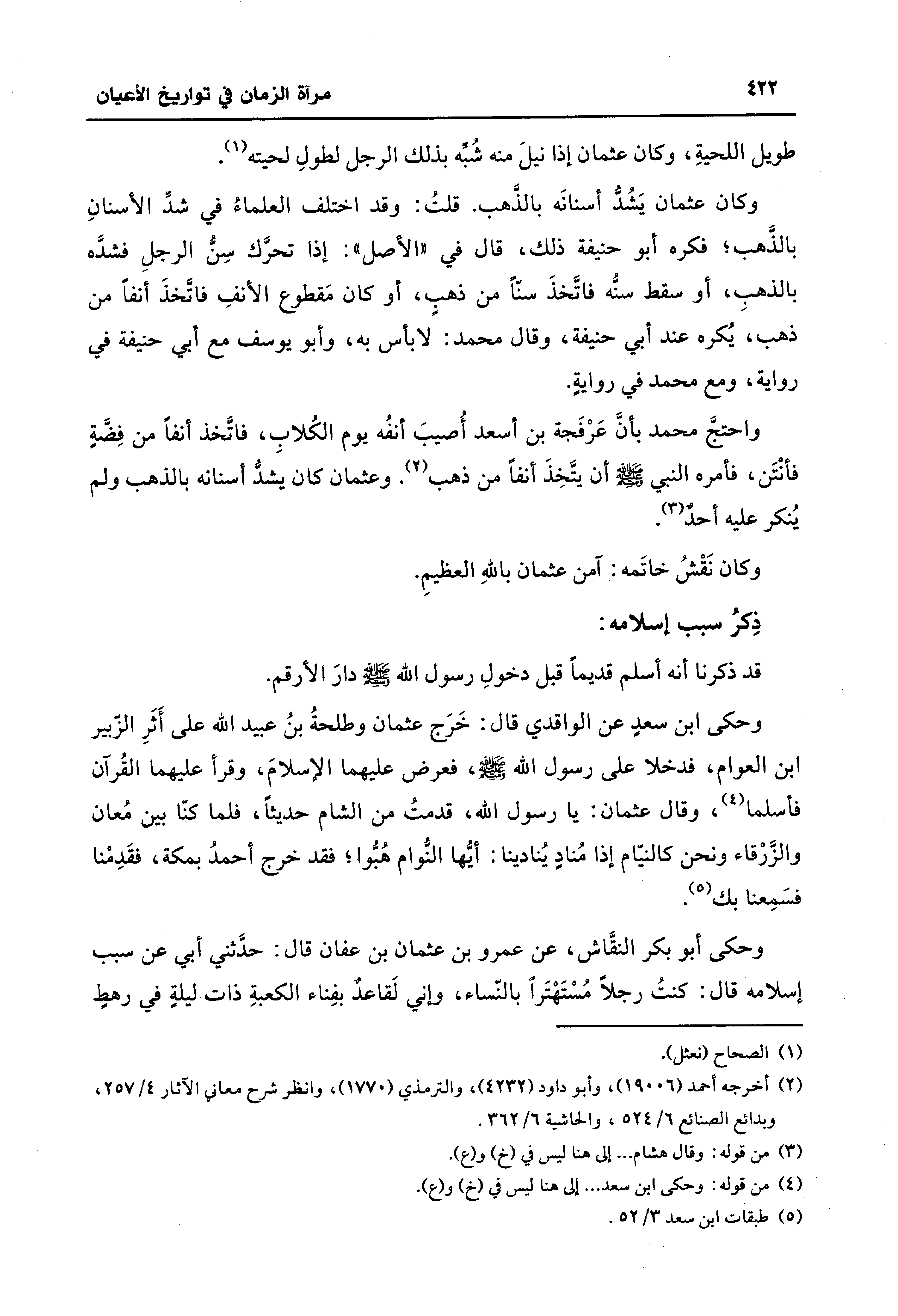 وحكى ابن سعدٍ عن الواقدي قال: خَرَج عثمان وطلحةُ بنُ عبيد اللَّه على أَثَرِ الزّبير ابن العوام، فدخلا على رسول اللَّه -صلى اللَّه عليه وسلم-، فعرض عليهما الإسلامَ، وقرأ عليهما القُرآن فأسلما (¬4)، وقال عثمان: يا رسول اللَّه، قدمتُ من الشام حديثًا، فلما كنّا بين مُعان والزَّرْقاء ونحن كالنيّام إذا مُنادٍ يُنادينا: أيُّها النُّوام هُبُّوا؛ فقد خرج أحمدُ بمكة، فقَدِمْنا فسَمِعنا بك (¬5).