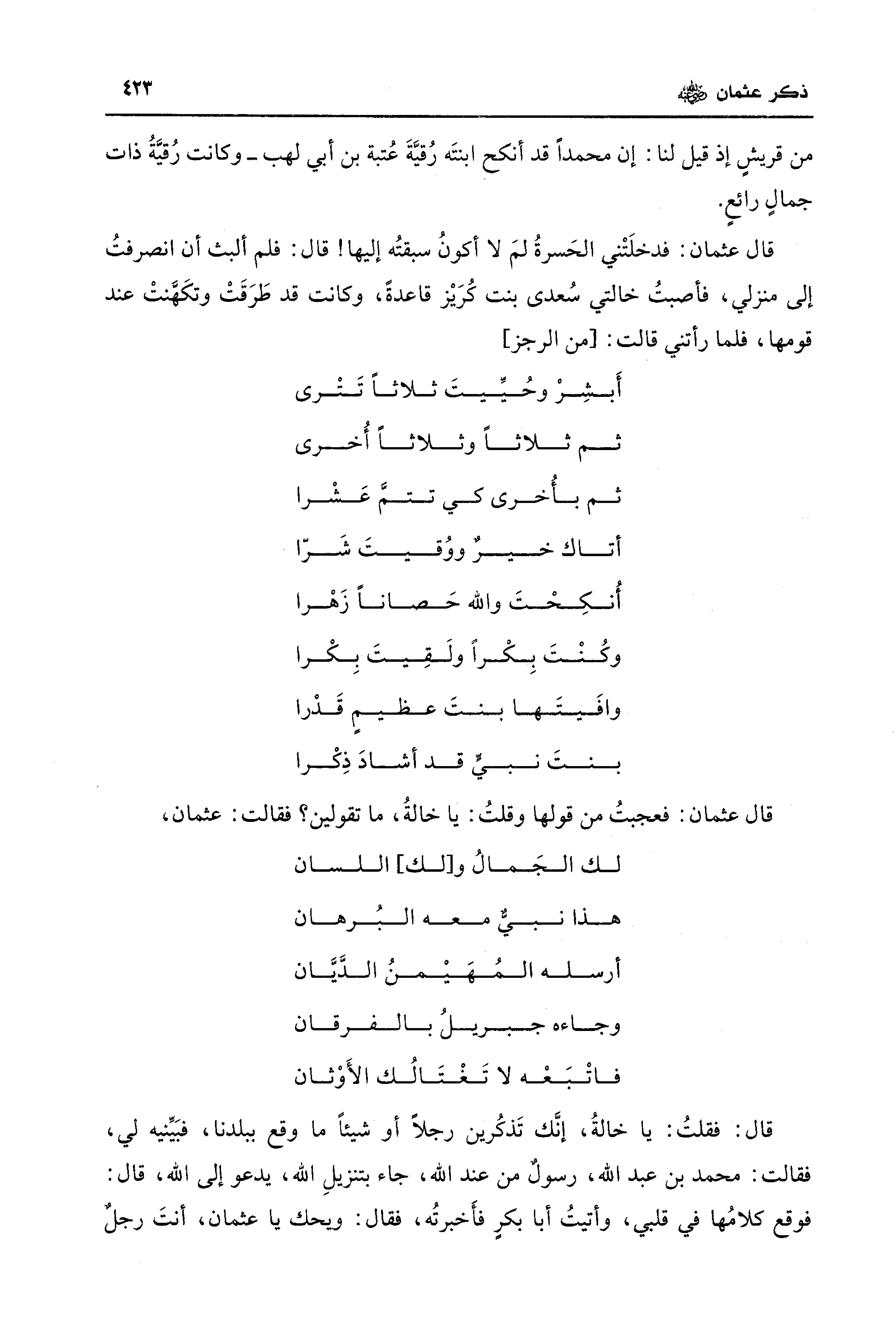 قال عثمان: فدخلَتْني الحَسرةُ لمَ لا أكونُ سبقتُه إليها! قال: فلم ألبث أن انصرفتُ إلى منزلي، فأصبتُ خالتي سُعدى بنت كُرَيْز قاعدةً، وكانت قد طَرَقَتْ وتكَهَّنتْ عند قومها، فلما رأتني قالت: [من الرجز]