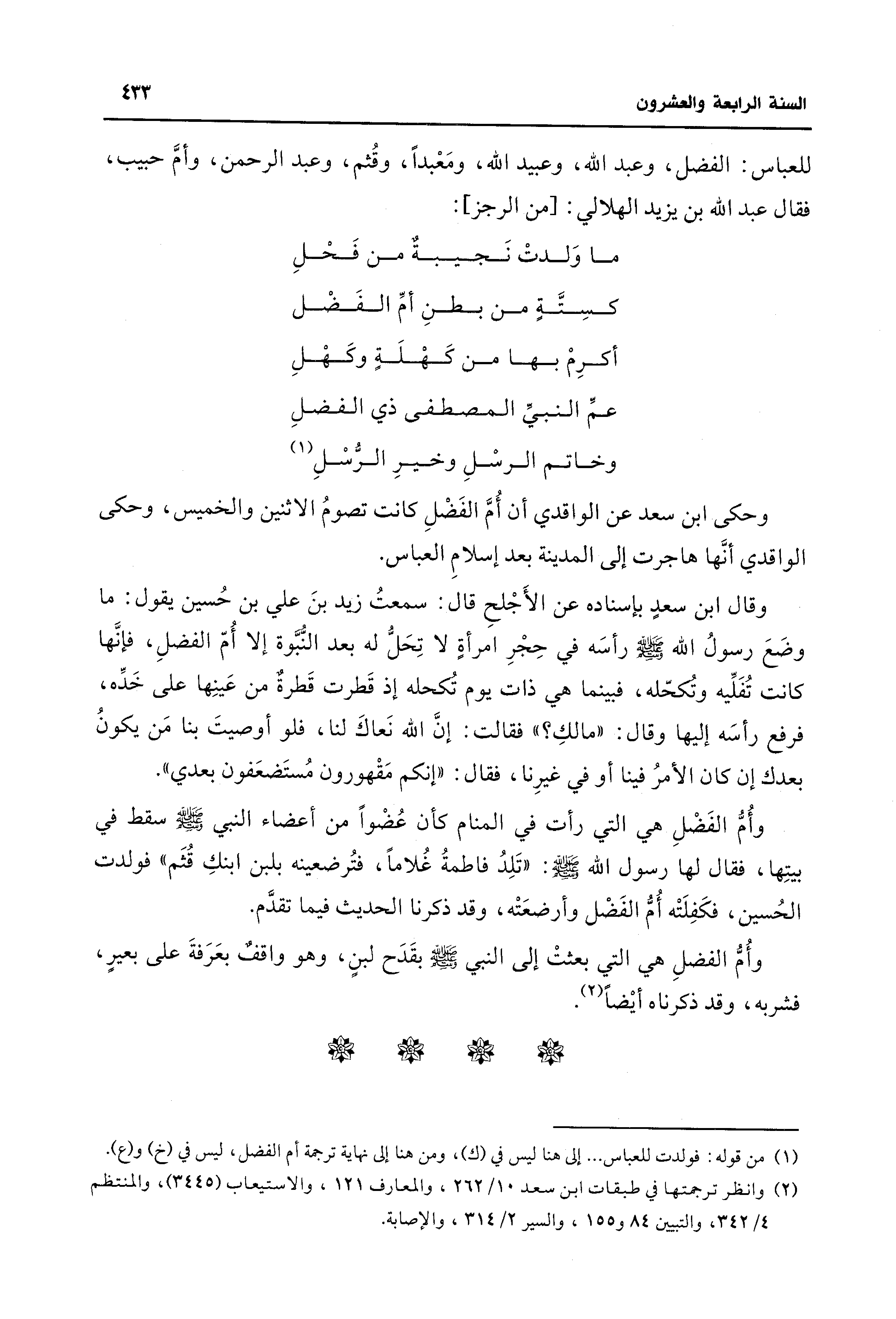 وأُمُّ الفَضْلِ هي التي رأت في المنام كأن عُضْوًا من أعضاء النبي -صلى اللَّه عليه وسلم- سقط في بيتِها، فقال لها رسول اللَّه -صلى اللَّه عليه وسلم-: "تَلِدُ فاطمةُ غُلامًا، فتُرضعينه بلبن ابنكِ قُثَم" فولدت الحُسين، فكَفِلَتْه أُمُّ الفَضْل وأرضعَتْه، وقد ذكرنا الحديث فيما تقدَّم.