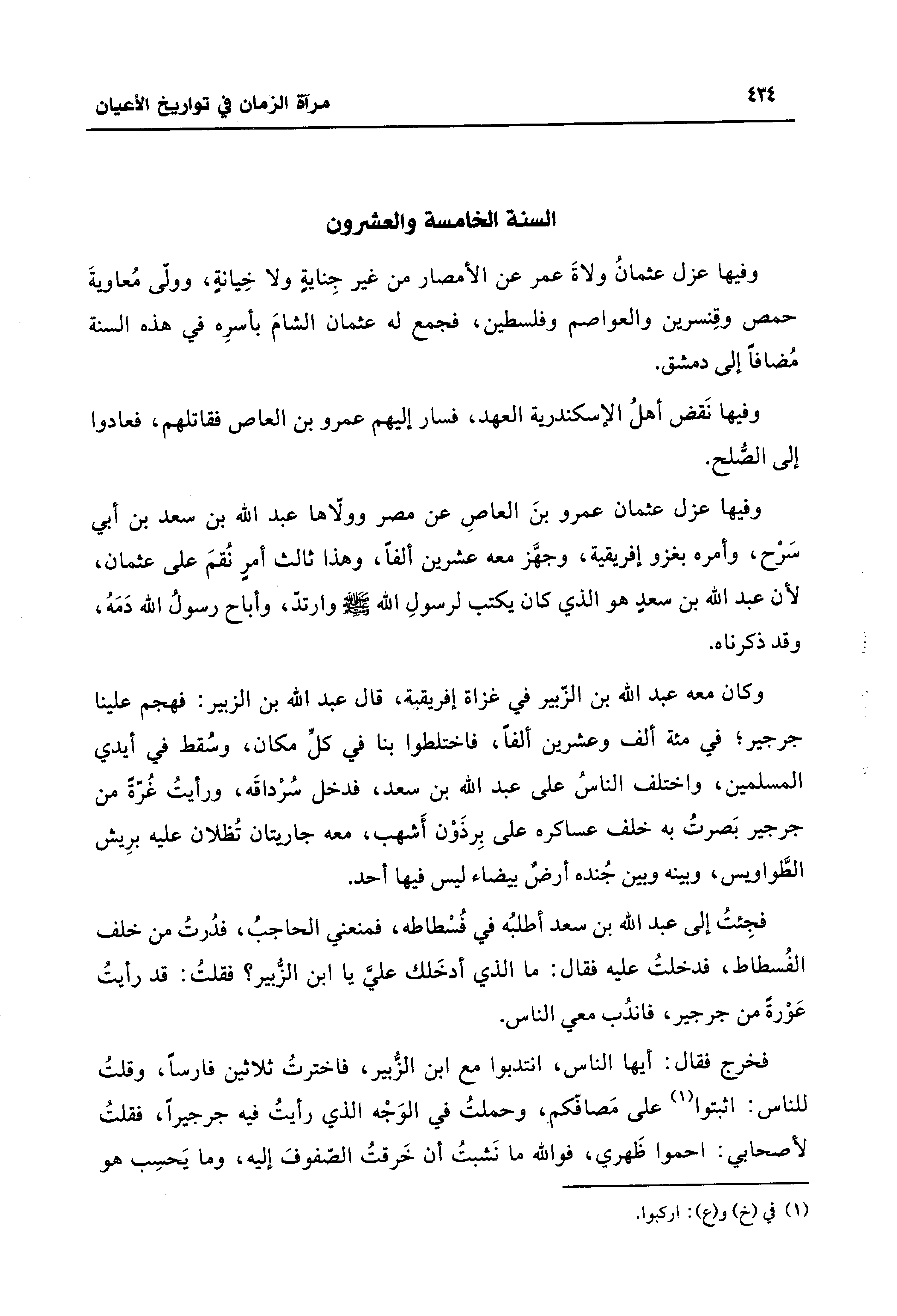 فجِئتُ إلى عبد اللَّه بن سعد أطلبُه في فُسْطاطه، فمنعني الحاجبُ، فدُرتُ من خلف الفُسطاط، فدخلتُ عليه فقال: ما الذي أدخَلك عليَّ يا ابن الزبير؟ فقلتُ: قد رأيتُ عَوْرةً من جرجير، فاندُب معي الناس.