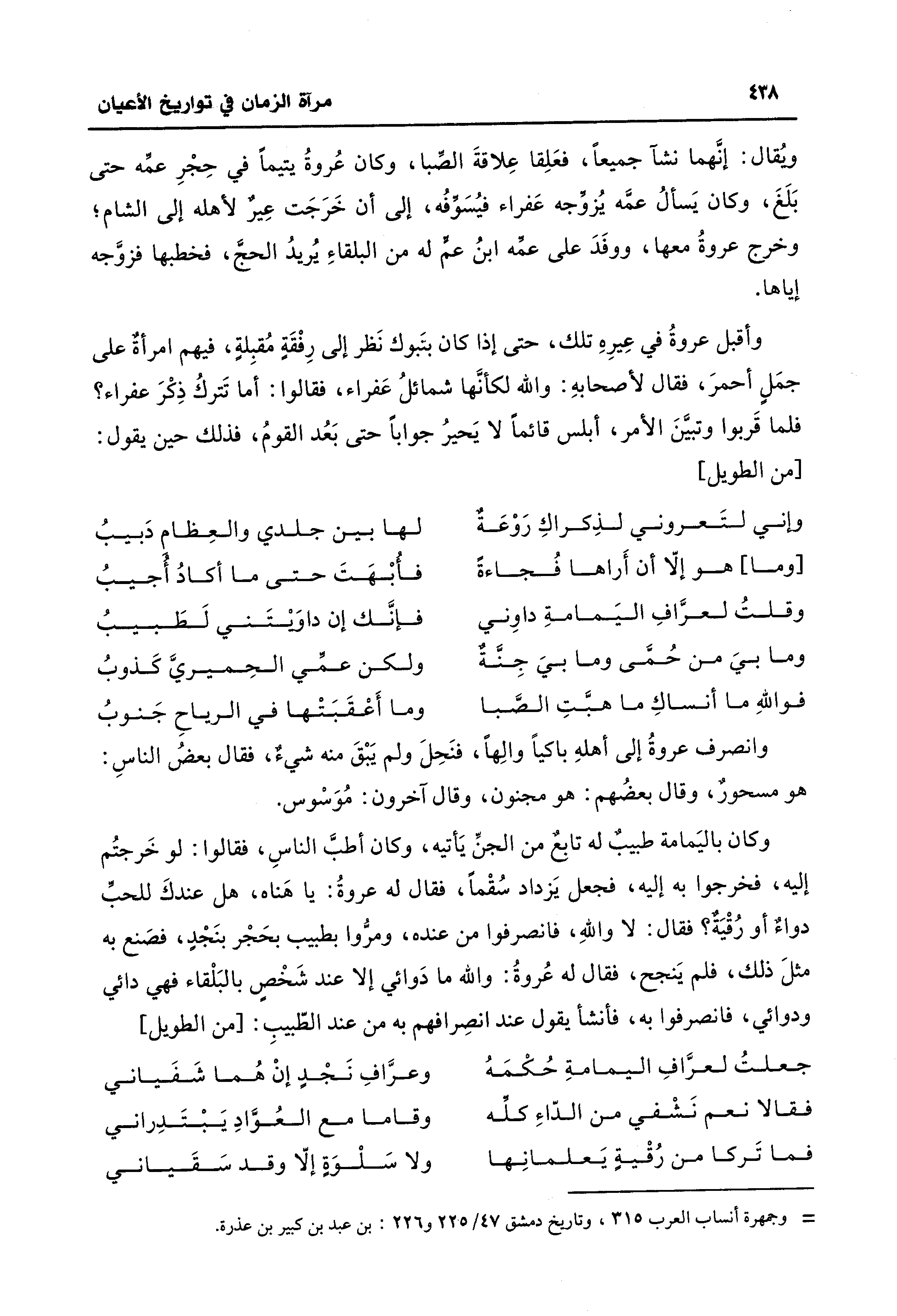 وأقبل عروةُ في عِيرِهِ تلك، حتى إذا كان بتَبوك نَظر إلى رِفْقَةٍ مُقبِلةٍ، فيهم امرأةٌ على جمَلٍ أحمرَ، فقال لأصحابهِ: واللَّه لكأنَّها شمائلُ عَفراء، فقالوا: أما تَتركُ ذِكْرَ عفراء؟ فلما قَربوا وتبيَّنَ الأمر، أبلس قائمًا لا يَحيرُ جوابًا حتى بَعُد القومُ، فذلك حين يقول: [من الطويل]