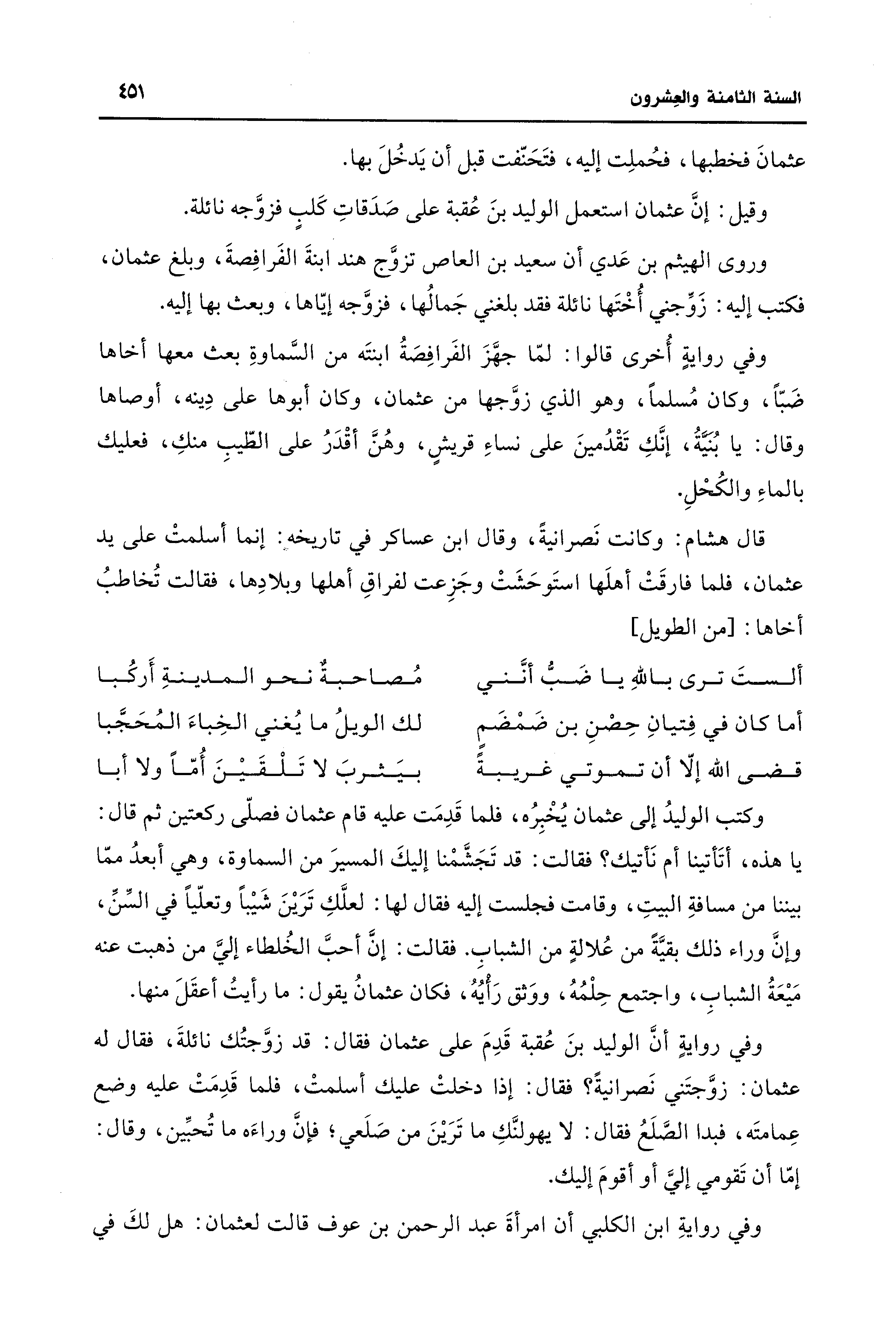 وكتب الوليدُ إلى عثمان يُخْبِرُه، فلما قَدِمَت عليه قام عثمان فصلّى ركعتين ثم قال: يا هذه، أتَأتينا أم نَأتيك؟ فقالت: قد تَجَشَّمْنا إليكَ المسيرَ من السماوة، وهي أبعدُ ممّا بيننا من مسافةِ البيتِ، وقامت فجلست إليه فقال لها: لعلَّكِ تَرَيْنَ شَيْبًا وتعلّيًا في السِّنِّ، وإنَّ وراء ذلك بقيَّة من عُلالةٍ من الشبابِ. فقالت: إنَ أحبَّ الخُلطاء إليَّ من ذهبت عنه مَيْعَةُ الشبابِ، واجتمع حِلْمُهُ، ووَثق رَأْيُهُ، فكان عثمانُ يقول: ما رأيتُ أعقَلَ منها.