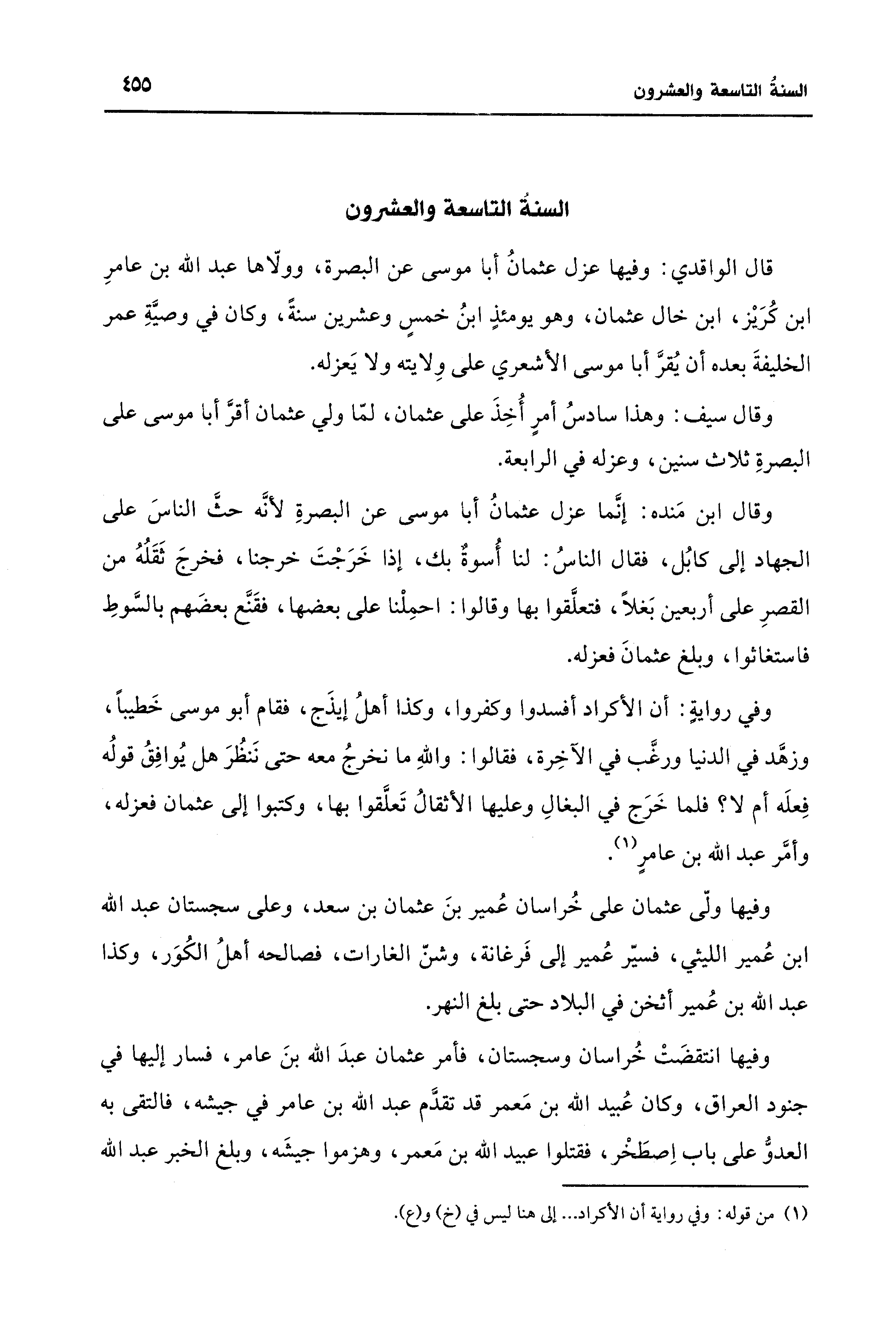 قال الواقدي: وفيها عزل عثمانُ أبا موسى عن البصرة، وولّاها عبد اللَّه بن عامرِ ابن كُرَيْز، ابن خال عثمان، وهو يومئذٍ ابنُ خمسٍ وعشرين سنةً، وكان في وصيَّةِ عمر الخليفةَ بعده أن يُقرَّ أبا موسى الأشعري على وِلايته ولا يَعزله.