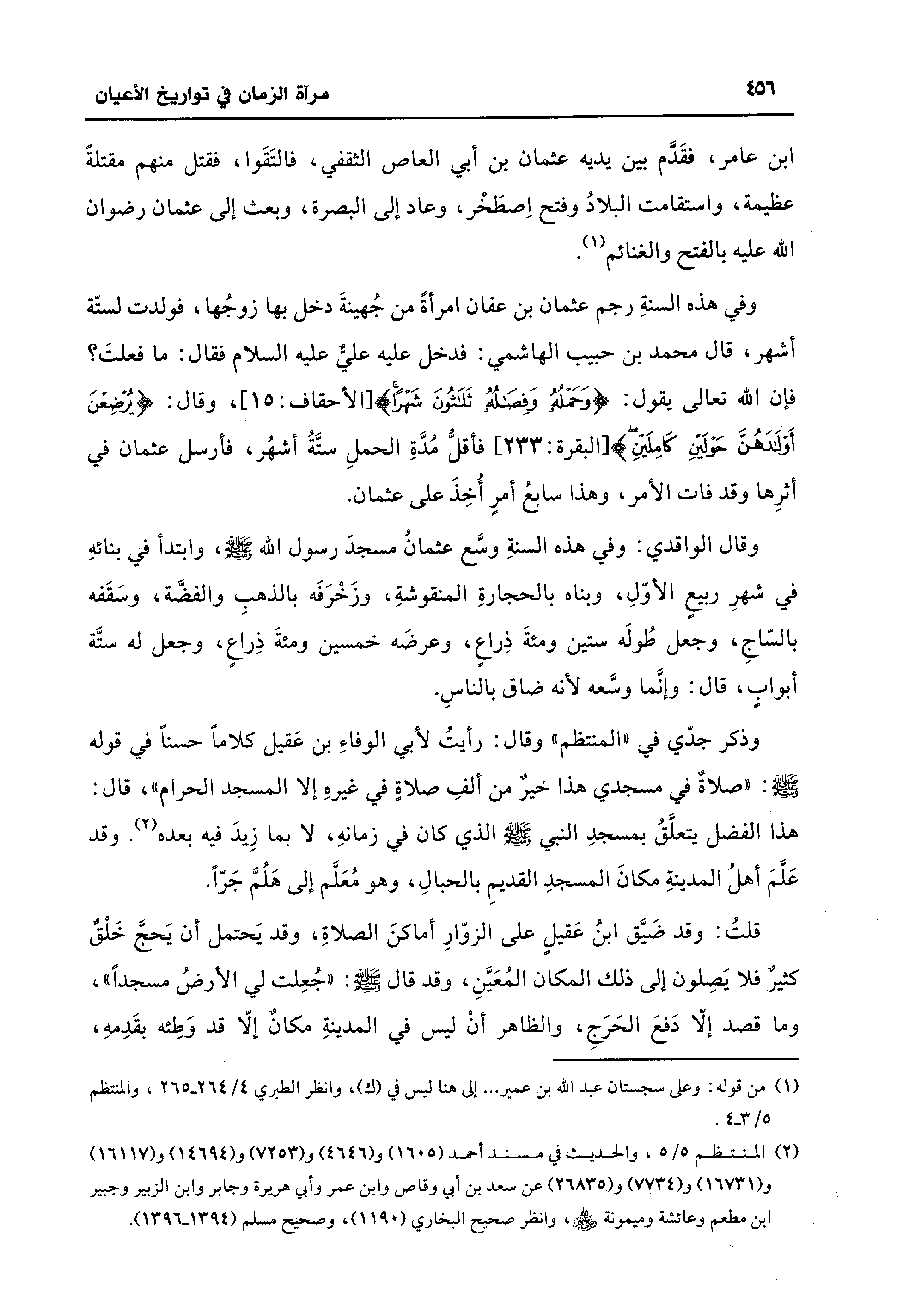وقال الواقدي: وفي هذه السنةِ وسَّع عثمانُ مسجدَ رسول اللَّه -صلى اللَّه عليه وسلم-، وابتدأ في بنائهِ في شهرِ ربيعٍ الأوّلِ، وبناه بالحجارةِ المنقوشةِ، وزَخْرَفَه بالذهبِ والفضَّة، وسَقَفه بالسّاجِ، وجعل طُولَه ستين ومئةَ ذِراعٍ، وعرضَه خمسين ومئةَ ذِراعٍ، وجعل له ستَّة أبوابٍ، قال: وإنَّما وسَّعه لأنه ضاق بالناسِ.
