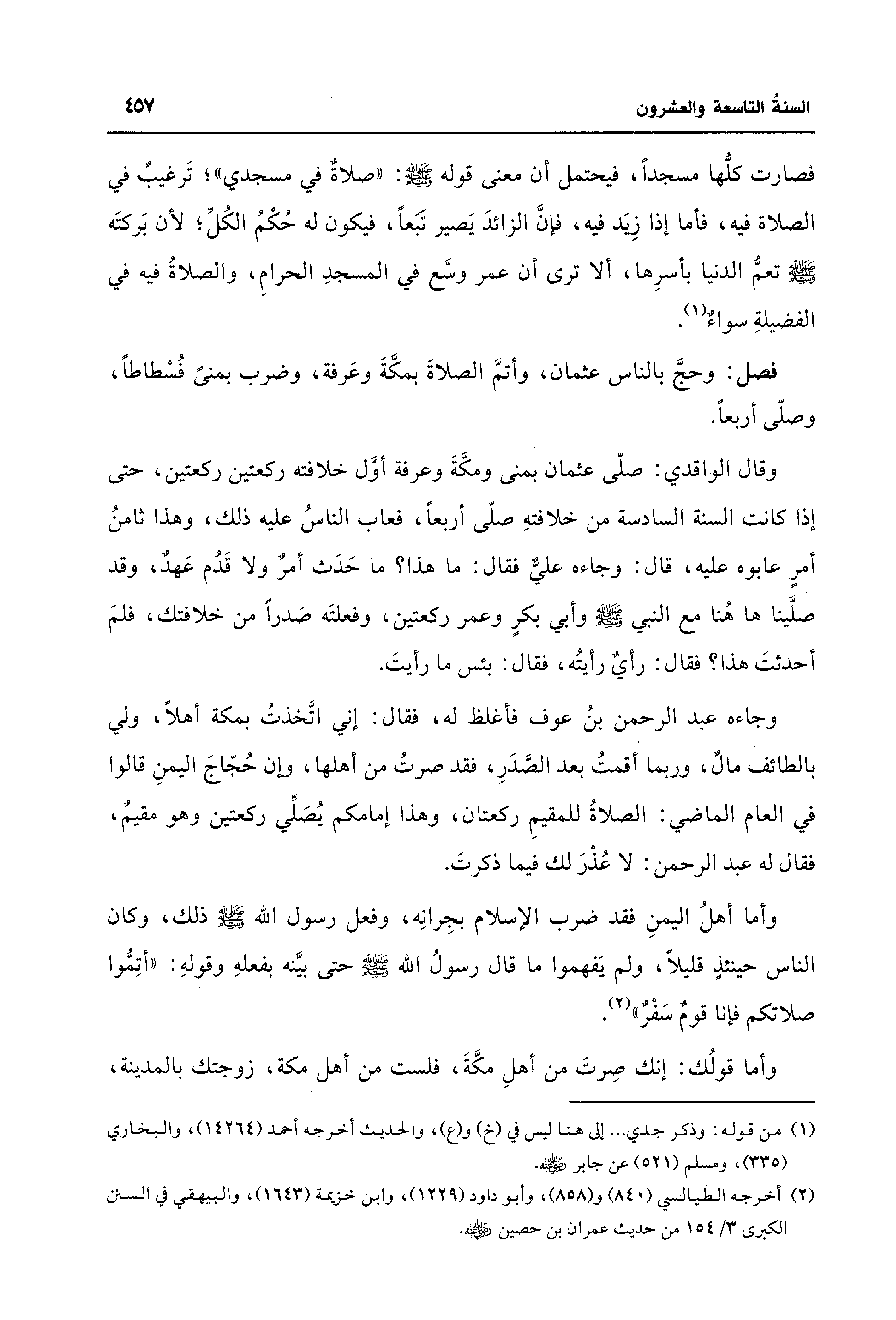 وجاءه عبد الرحمن بنُ عوف فأغلظ له، فقال: إني اتَّخذتُ بمكة أهلًا، ولي بالطائف مالٌ، وربما أقمتُ بعد الصَّدَرِ، فقد صرتُ من أهلها، وإن حُجّاجَ اليمنِ قالوا في العام الماضي: الصلاةُ للمقيمِ ركعتان، وهذا إمامكم يُصَلِّي ركعتين وهو مقيمٌ، فقال له عبد الرحمن: لا عُذْرَ لك فيما ذكرتَ.