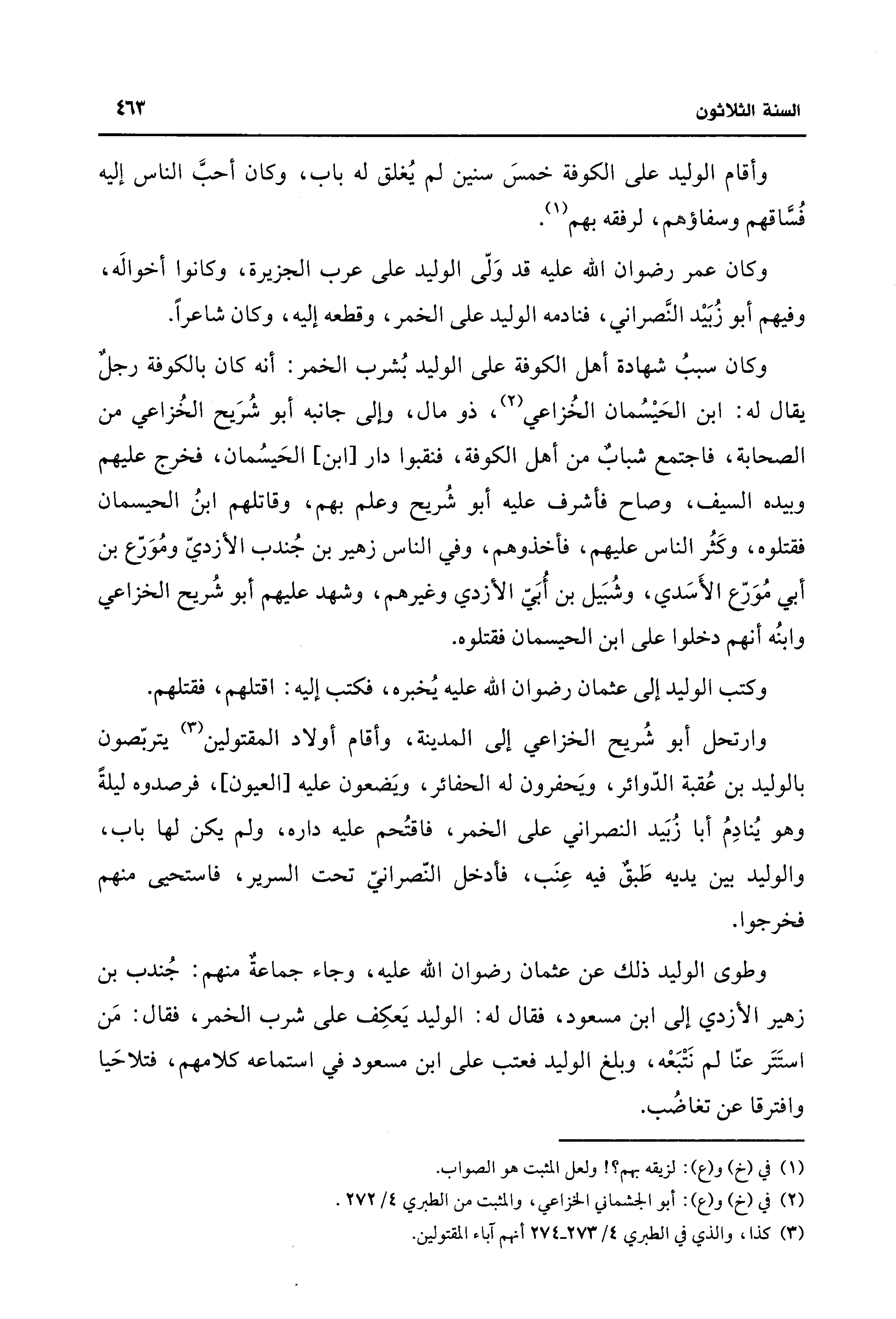 وكان سببُ شهادة أهل الكوفة على الوليد بُشرب الخمر: أنه كان بالكوفة رجلٌ يقال له: ابن الحَيْسُمان الخُزاعي (¬2)، ذو مال، وإلى جانبه أبو شُرَيح الخُزاعي من الصحابة، فاجتمع شبابٌ من أهل الكوفة، فنقبوا دار [ابن] الحَيسُمان، فخرج عليهم وبيده السيف، وصاح فأشرف عليه أبو شُريح وعلم بهم، وقاتلهم ابنُ الحيسمان فقتلوه، وكَثُر الناس عليهم، فأخذوهم، وفي الناس زهير بن جُندب الأزديّ ومُوَرعّ بن أبي مُوَرّع الأَسَدي، وشُبَيل بن أُبَيّ الأزدي وغيرهم، وشهد عليهم أبو شُريح الخزاعي وابنُه أنهم دخلوا على ابن الحيسمان فقتلوه.