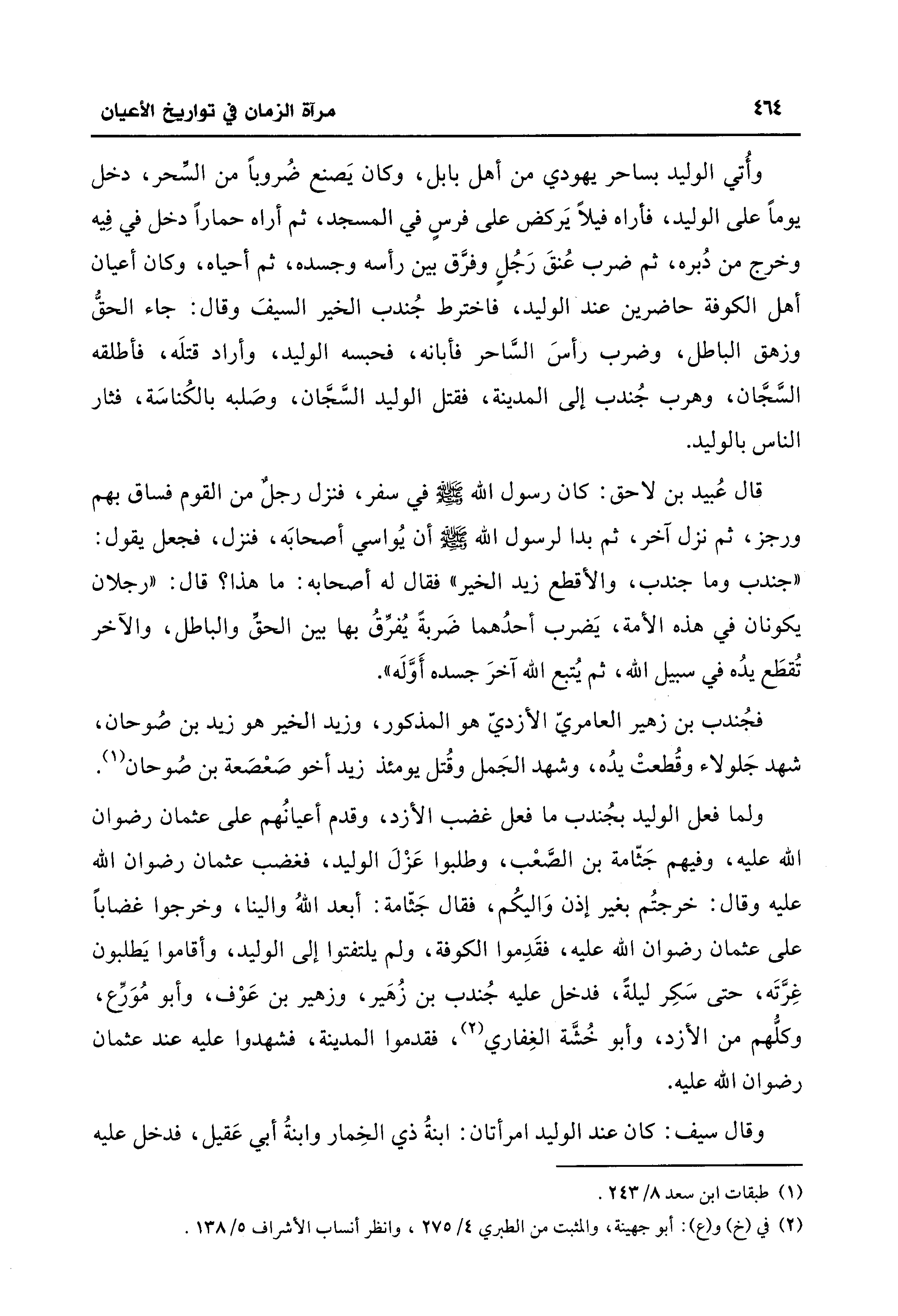 وأُتي الوليد بساحر يهودي من أهل بابل، وكان يَصنع ضُروبًا من السِّحر، دخل يومًا على الوليد، فأراه فيلًا يَركض على فرسٍ في المسجد، ثم أراه حمارًا دخل في فِيه وخرج من دُبره، ثم ضرب عُنقَ رَجُلٍ وفرَّق بين رأسه وجسده، ثم أحياه، وكان أعيان أهل الكوفة حاضرين عند الوليد، فاخترط جُندب الخير السيفَ وقال: جاء الحقُّ وزهق الباطل، وضرب رأسَ السَّاحر فأبانه، فحبسه الوليد، وأراد قتلَه، فأطلقه السَّجَّان، وهرب جُندب إلى المدينة، فقتل الوليد السَّجَّان، وصَلبه بالكُناسَة، فثار الناس بالوليد.