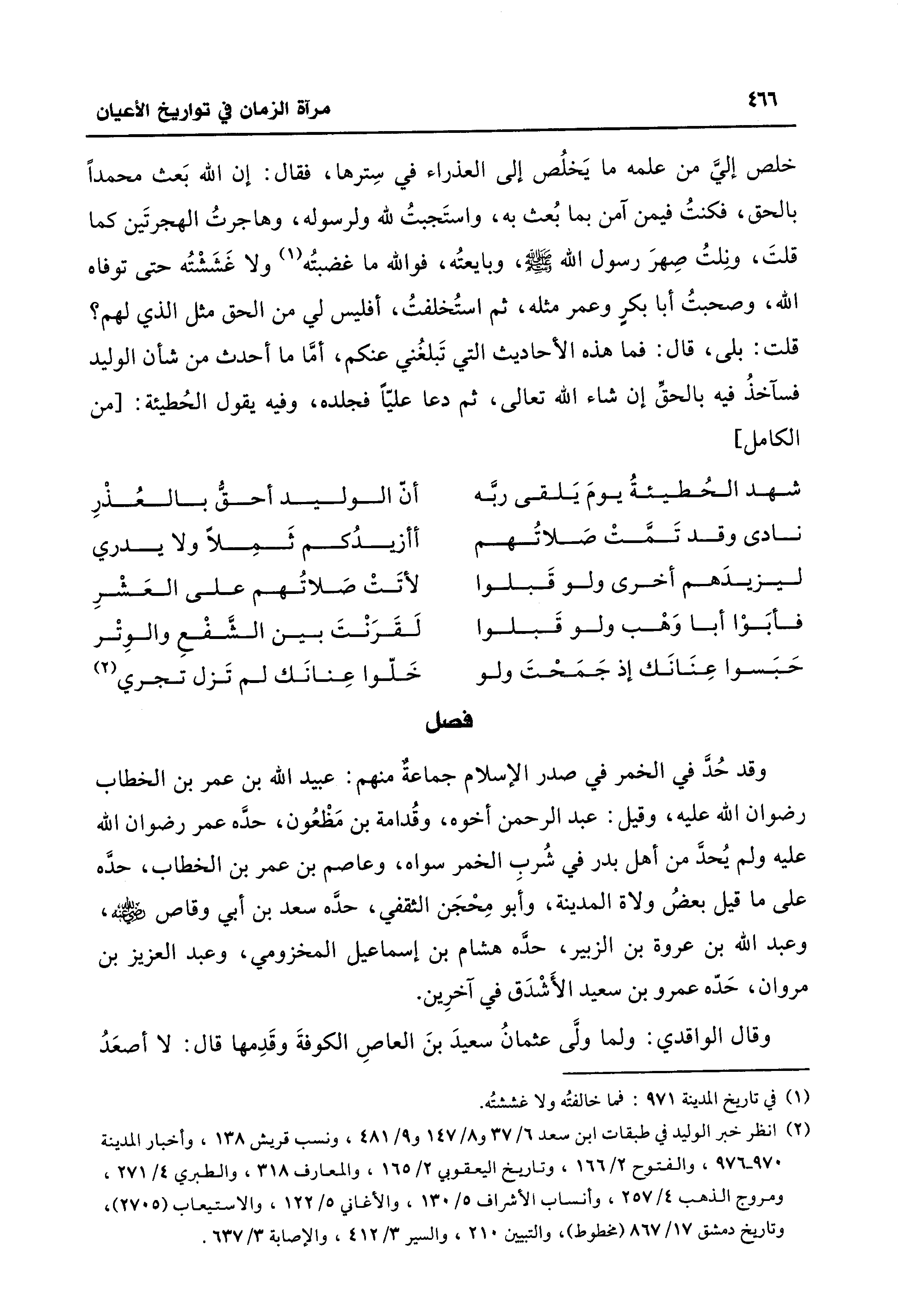 خلص إليَّ من علمه ما يَخلُص إلى العذراء في سِترها، فقال: إن اللَّه بَعث محمدًا بالحق، فكنتُ فيمن آمن بما بُعث به، واستَجبتُ اللَّه ولرسوله، وهاجرتُ الهجرتَين كما قلتَ، ونِلتُ صِهرَ رسول اللَّه -صلى اللَّه عليه وسلم-، وبايعتُه، فواللَّه ما غضبتُه (¬1) ولا غَشَشْتُه حتى توفاه اللَّه، وصحبتُ أبا بكرٍ وعمر مثله، ثم استُخلفتُ، أفليس لي من الحق مثل الذي لهم؟ قلت: بلى، قال: فما هذه الأحاديث التي تَبلغُني عنكم، أمَّا ما أحدث من شأن الوليد فسآخذُ فيه بالحقِّ إن شاء اللَّه تعالى، ثم دعا عليًّا فجلده، وفيه يقول الحُطيئة: [من الكامل]