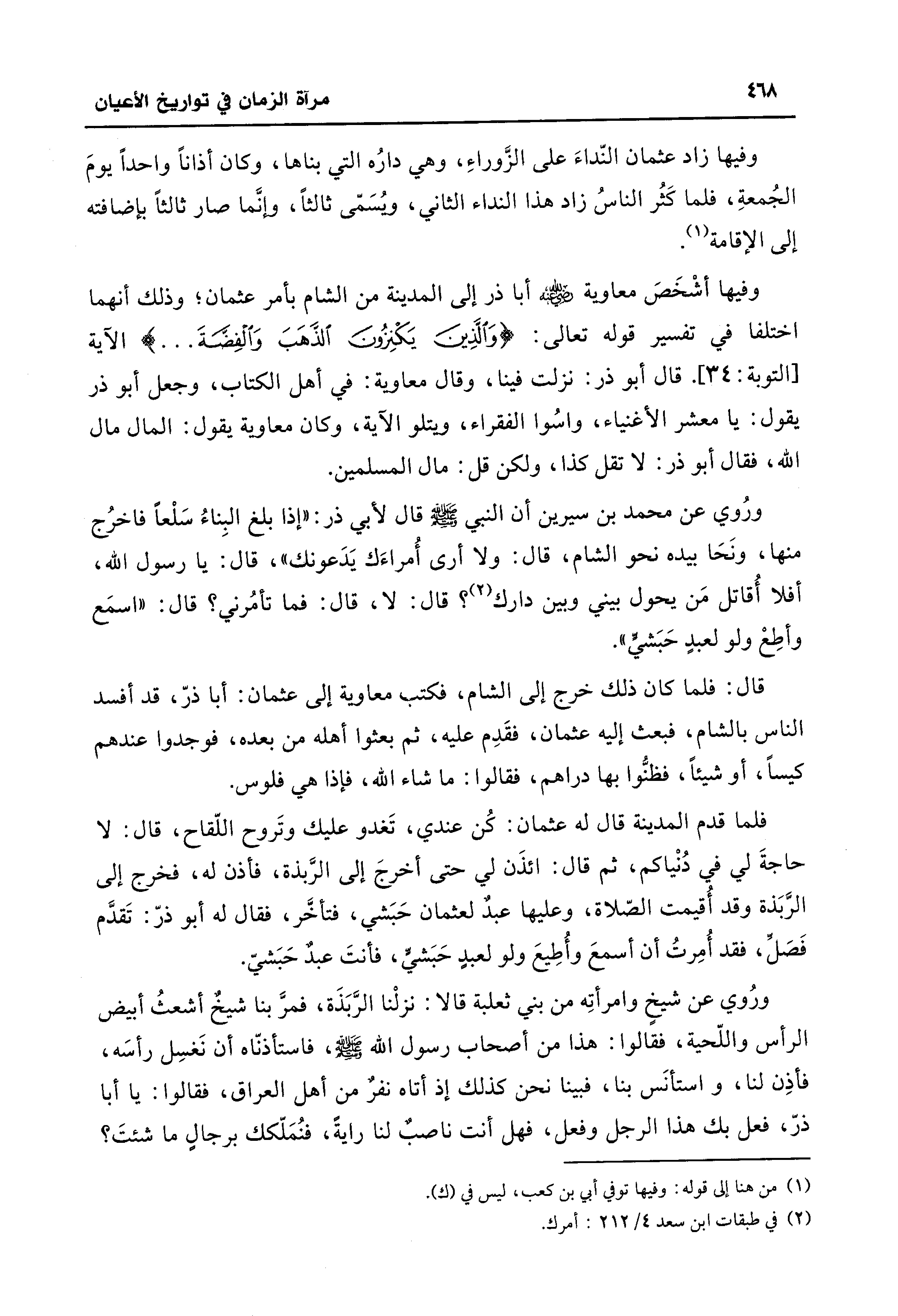 وفيها أشْخَصَ معاوية -رضي اللَّه عنه- أبا ذر إلى المدينة من الشام بأمر عثمان؛ وذلك أنهما اختلفا في تفسير قوله تعالى: {وَالَّذِينَ يَكْنِزُونَ الذَّهَبَ وَالْفِضَّةَ. . .} الآية [التوبة: 34]. قال أبو ذر: نزلت فينا، وقال معاوية: في أهل الكتاب، وجعل أبو ذر يقول: يا معشر الأغنياء، واسُوا الفقراء، ويتلو الآية، وكان معاوية يقول: المال مال اللَّه، فقال أبو ذر: لا تقل كذا، ولكن قل: مال المسلمين.