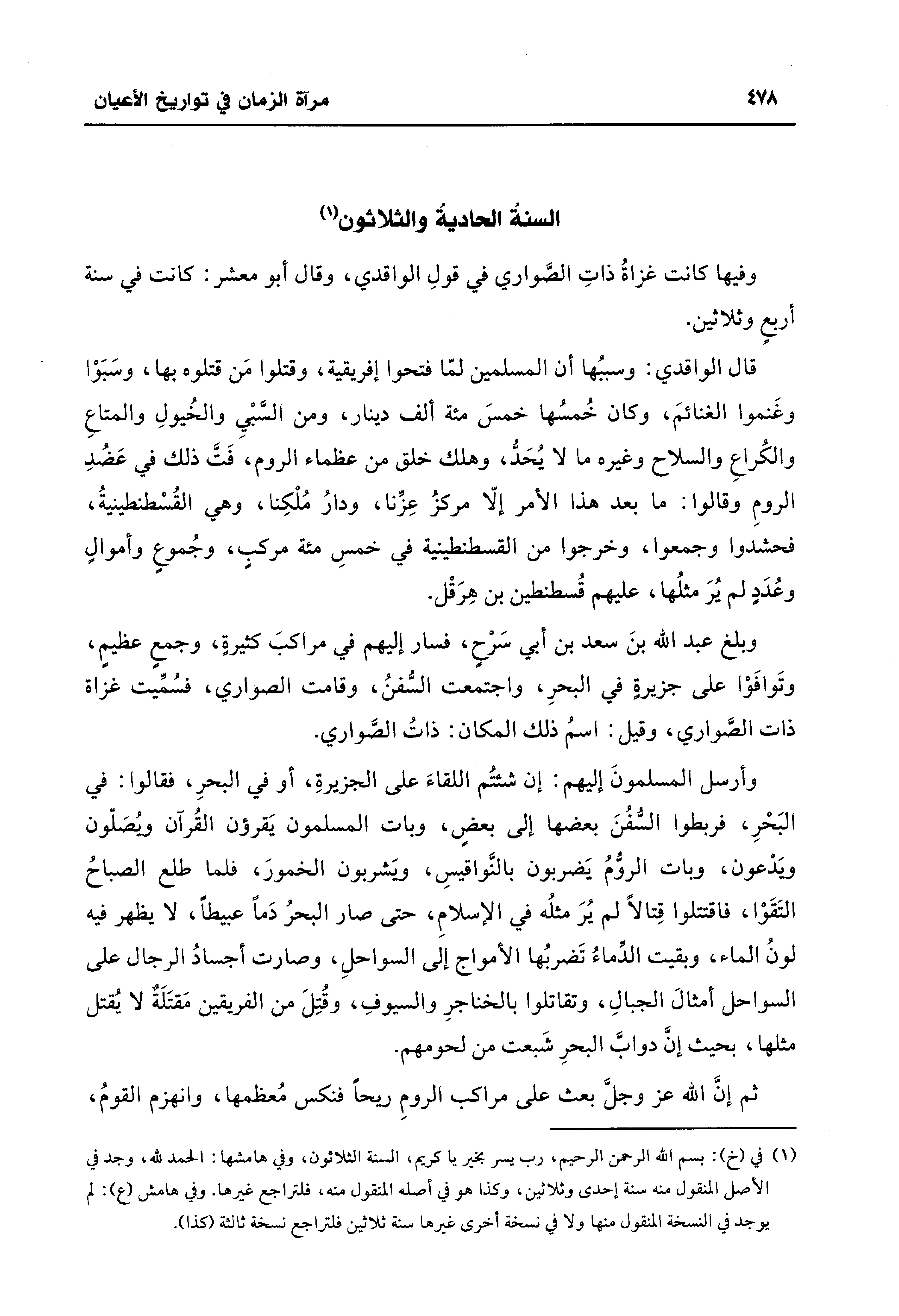 وفيها كانت غزاةُ ذاتِ الصَّواري في قولِ الواقدي، وقال أبو معشر: كانت فى سنة أربعٍ وثلاثين.