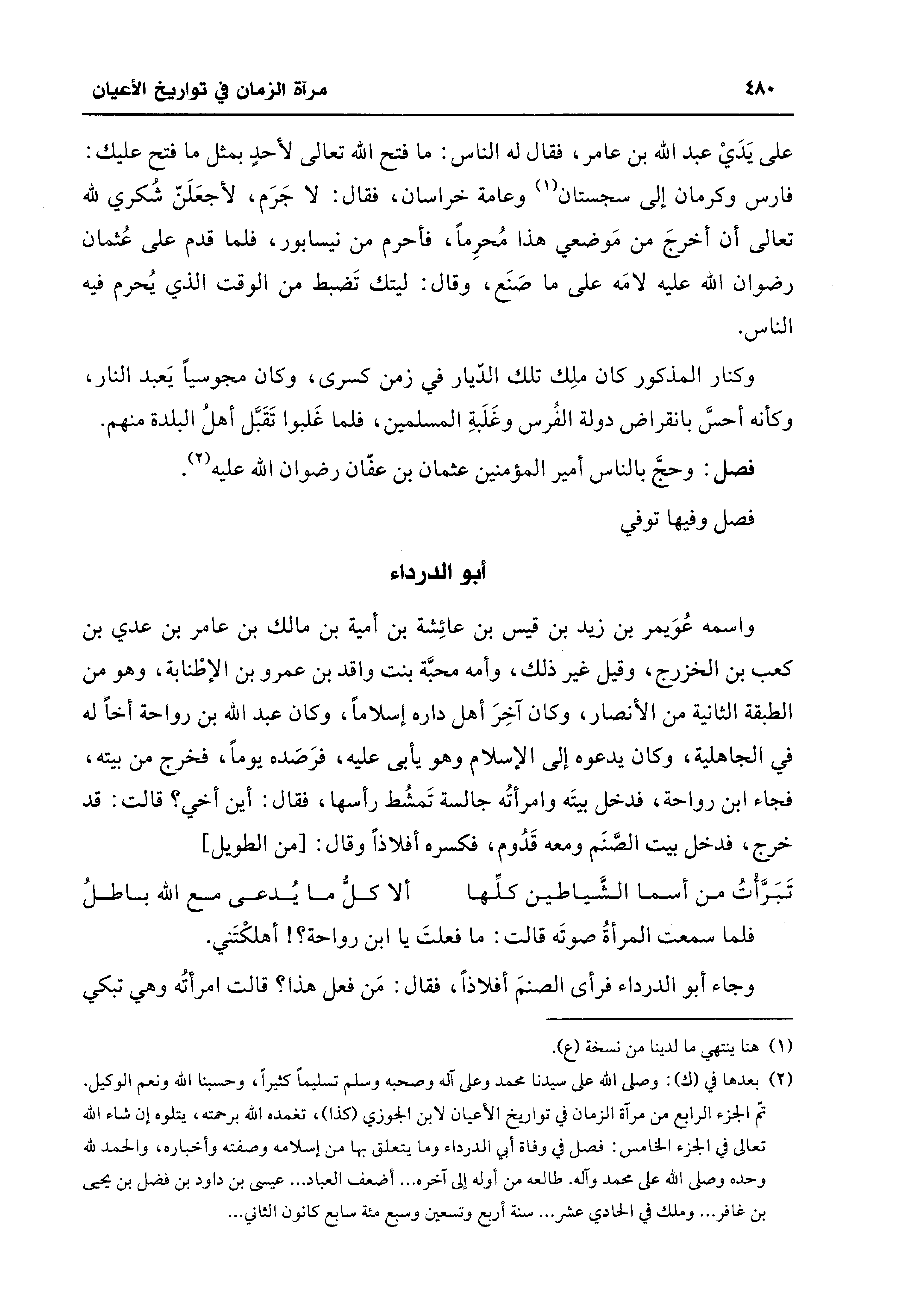 (¬2) بعدها في (ك): وصلى اللَّه على سيدنا محمد وعلى آله وصحبه وسلم تسليمًا كثيرًا، وحسبنا اللَّه ونعم الوكيل. تمّ الجزء الرابع من مرآة الزمان في تواريخ الأعيان لابن الجوزي (كذا)، تغمده اللَّه برحمته، يتلوه إن شاء اللَّه تعالى في الجزء الخامس: فصل في وفاة أبي الدرداء وما يتعلق بها من إسلامه وصفته وأخباره، والحمد للَّه وحده وصلى اللَّه على محمد وآله. طالعه من أوله إلى آخره. . . أضعف العباد. . . عيسى بن داود بن فضل بن يحيى بن غافر. . . وملك في الحادي عشر. . . سنة أربع وتسعين وسبع مئة سابع كانون الثاني. . .