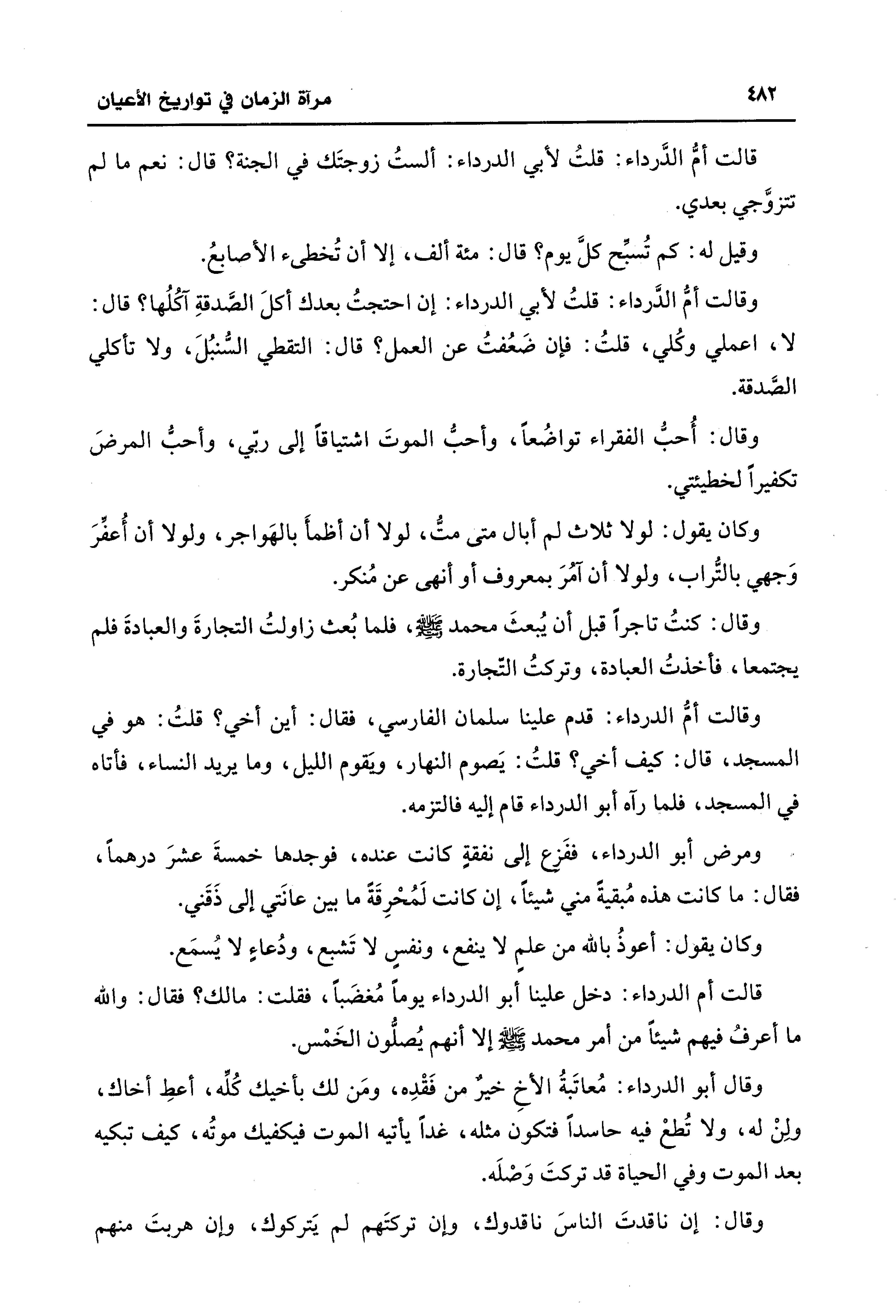 وقالت أتمُّ الدَّرداء: قلتُ لأبي الدرداء: إن احتجتُ بعدك أكلَ الصَّدقةِ آكُلُها؟ قال: لا، اعملي وكُلي، قلتُ: فإن ضَعُفتُ عن العمل؟ قال: التقطي السُّنبُلَ، ولا تأكلي الصَّدقة.