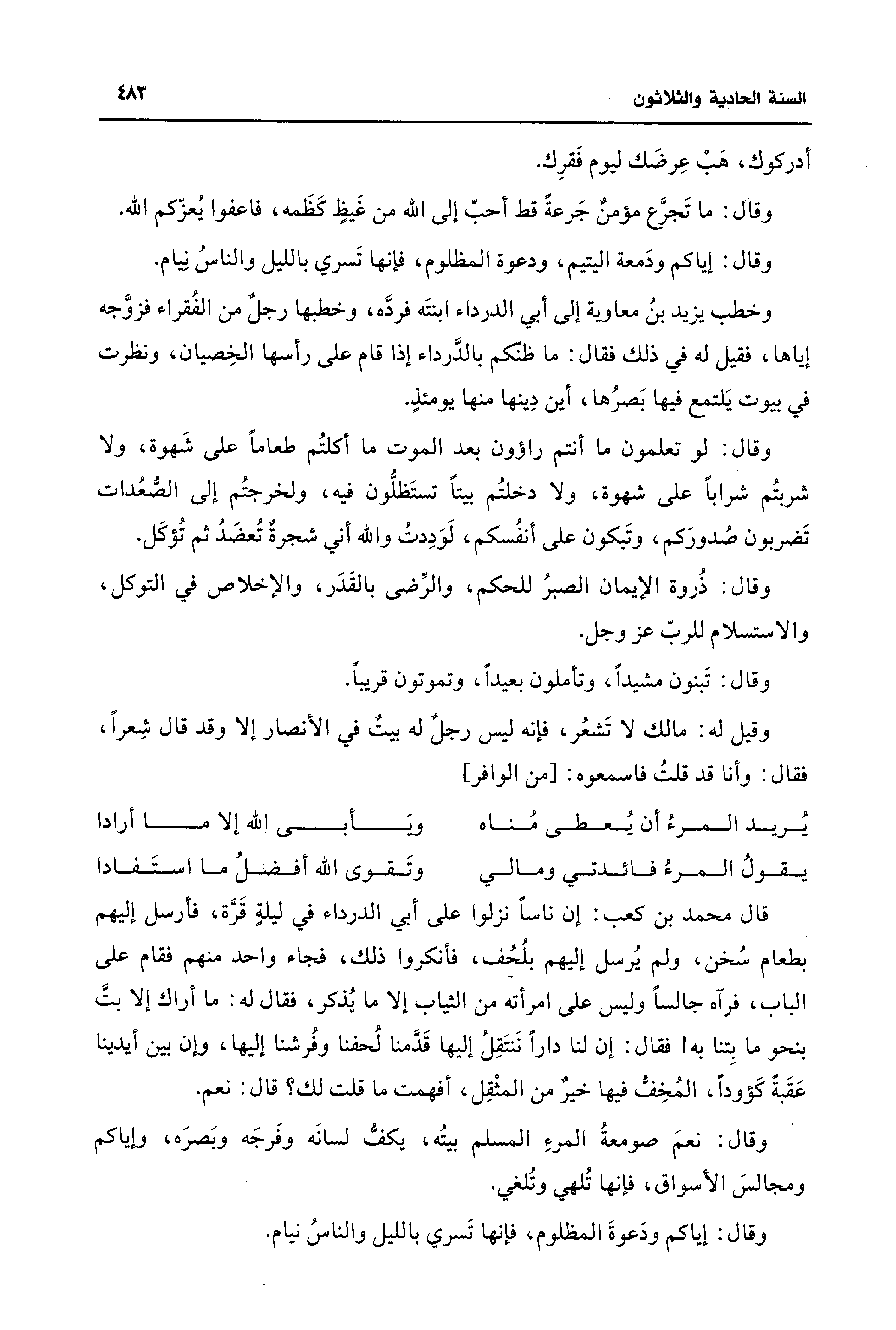 وخطب يزيد بنُ معاوية إلى أبي الدرداء ابنتَه فردَّه، وخطبها رجلٌ من الفُقراء فزوَّجه إياها، فقيل له في ذلك فقال: ما ظنكم بالدَّرداء إذا قام على رأسها الخِصيان، ونظرت في بيوت يَلتمع فيها بَصرُها، أين دِينها منها يومئذٍ.