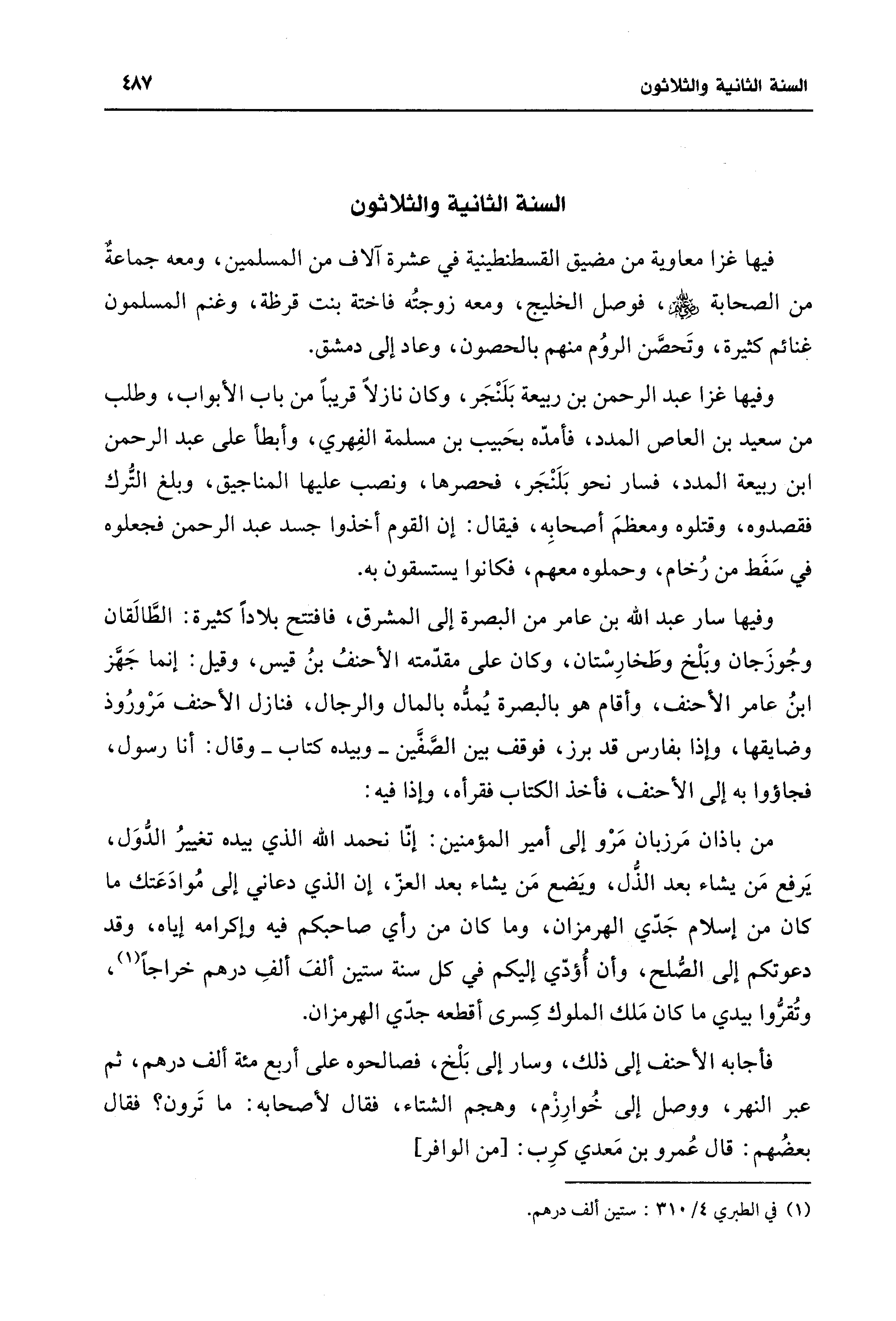 وفيها سار عبد اللَّه بن عامر من البصرة إلى المشرق، فافتتح بلادًا كثيرة: الطَّالَقان وجُوزَجان وبَلْخ وطَخارِسْتان، وكان على مقدّمته الأحنفُ بنُ قيس، وقيل: إنما جَهَّز ابنُ عامر الأحنف، وأقام هو بالبصرة يُمدُّه بالمال والرجال، فنازل الأحنف مَرْورُوذ وضايقها، وإذا بفارس قد برز، فوقف بين الضَفَّين -وبيده كتاب- وقال: أنا رسول، فجاؤوا به إلى الأحنف، فأخذ الكتاب فقرأه، وإذا فيه:
