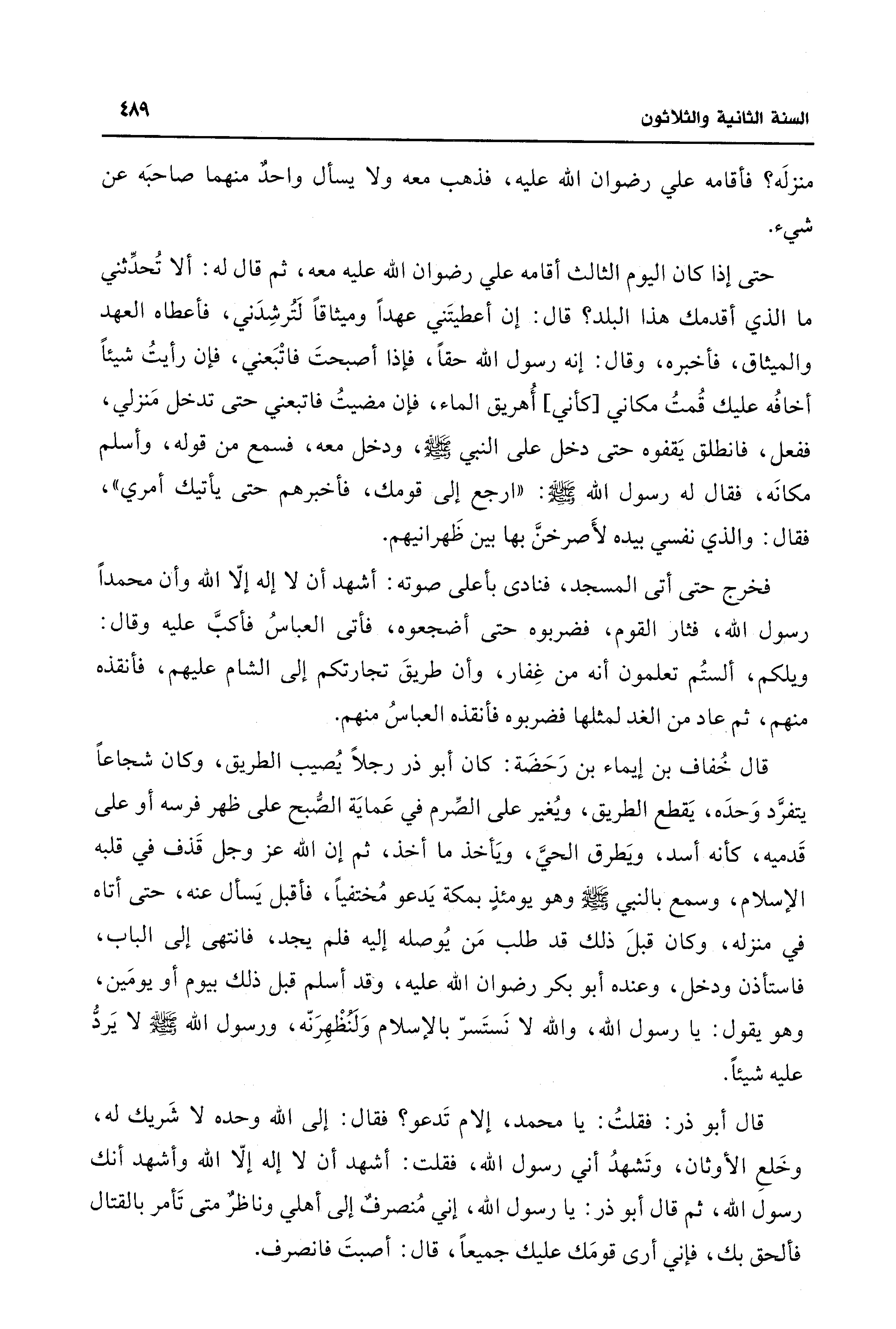 قال أبو ذر: فقلتُ: يا محمد، إلام تَدعو؟ فقال: إلى الله وحده لا شَريك له، وخَلعِ الأوثان، وتَشهدُ أني رسول الله، فقلت: أشهد أن لا إله إلّا الله وأشهد أنك رسول الله، ثم قال أبو ذر: يا رسول الله، إنِّي مُنصرفٌ إلى أهلي وناظرٌ متى تَأمر بالقتال فألحق بك، فإني أرى قومَك عليك جميعًا، قال: أصبتَ فانصرف.