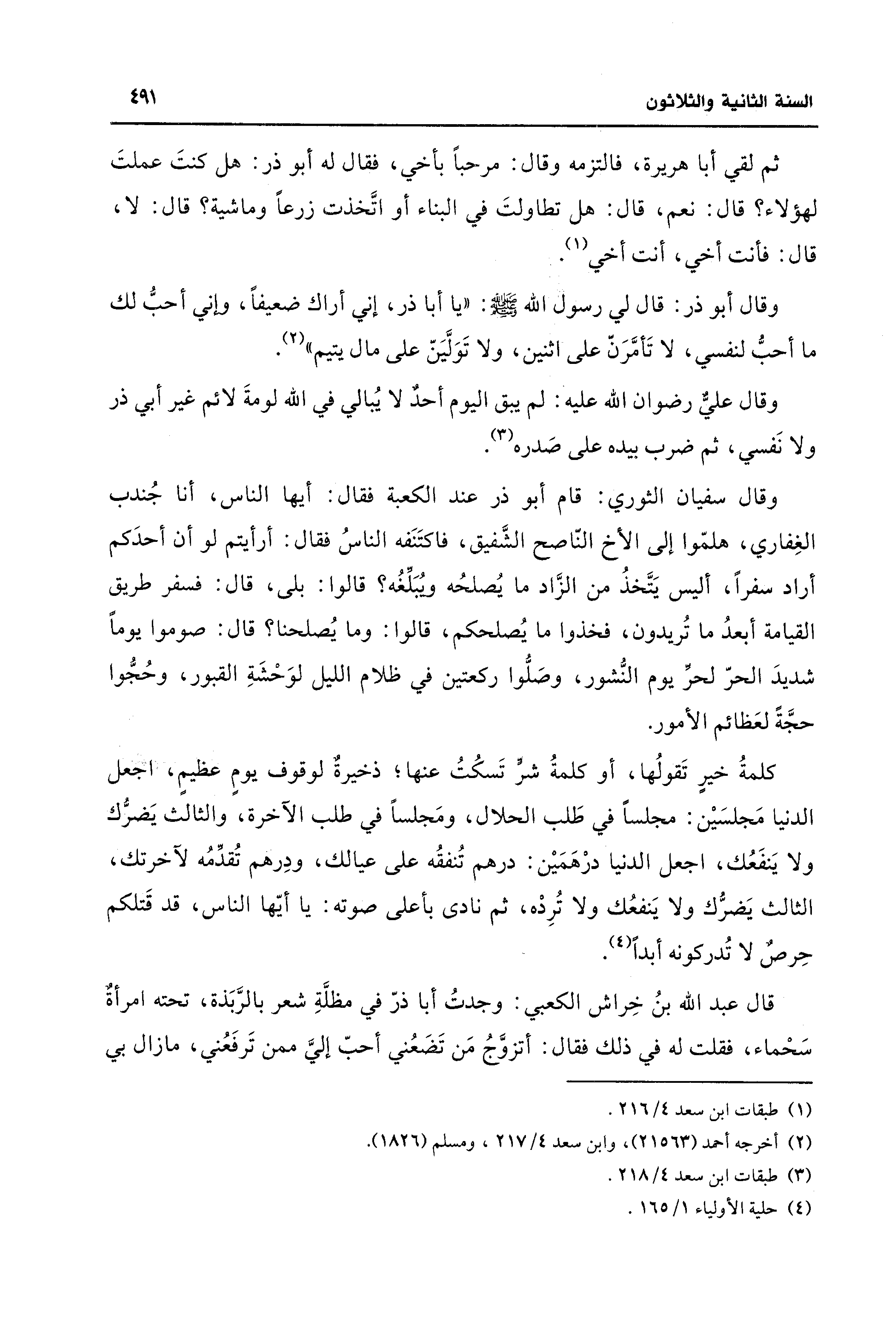 ثم لقي أبا هريرة، فالتزمه وقال: مرحبًا بأخي، فقال له أبو ذر: هل كنتَ عملتَ لهؤلاء؟ قال: نعم، قال: هل تطاولتَ في البناء أو اتَّخذت زرعًا وماشية؟ قال: لا، قال: فأنت أخي، أنت أخي (¬1).