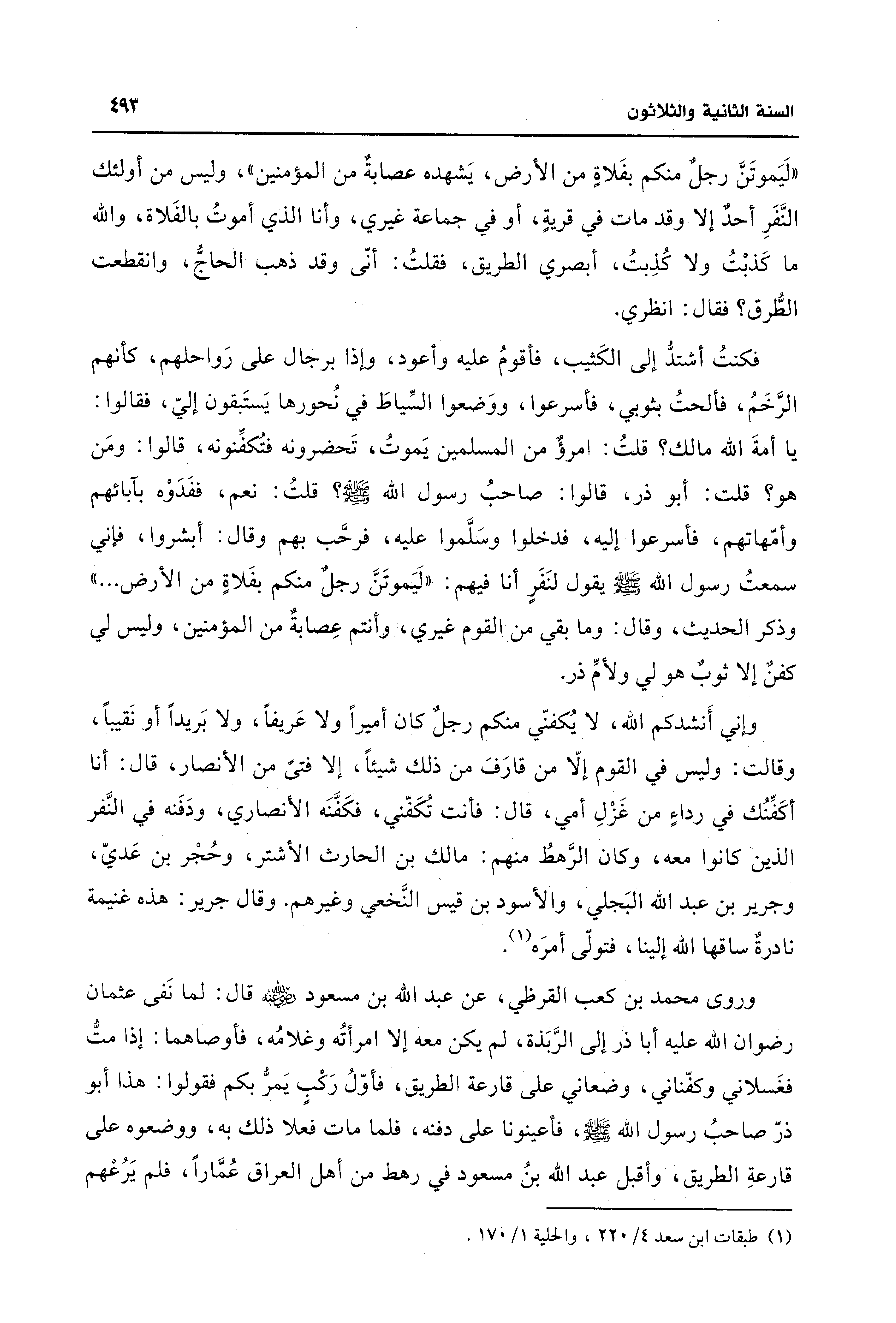 وروى محمد بن كعب القرظي، عن عبد الله بن مسعود - رضي الله عنه - قال: لما نَفى عثمان رضوان الله عليه أبا ذر إلى الرَّبَذة، لم يكن معه إلَّا امرأتُه وغلامُه، فأوصاهما: إذا متُّ فغَسلاني وكفّناني، وضعاني على قارعة الطَّريق، فأوّلُ رَكْبٍ يَمرُّ بكم فقولوا: هذا أبو ذرّ صاحبُ رسول الله - صَلَّى الله عليه وسلم-، فأعينونا على دفنه، فلما مات فعلًا ذلك به، ووضعوه على قارعةِ الطَّريق، وأقبل عبد الله بنُ مسعود في رهط من أهل العراق عُمَّارًا، فلم يَرُعْهم