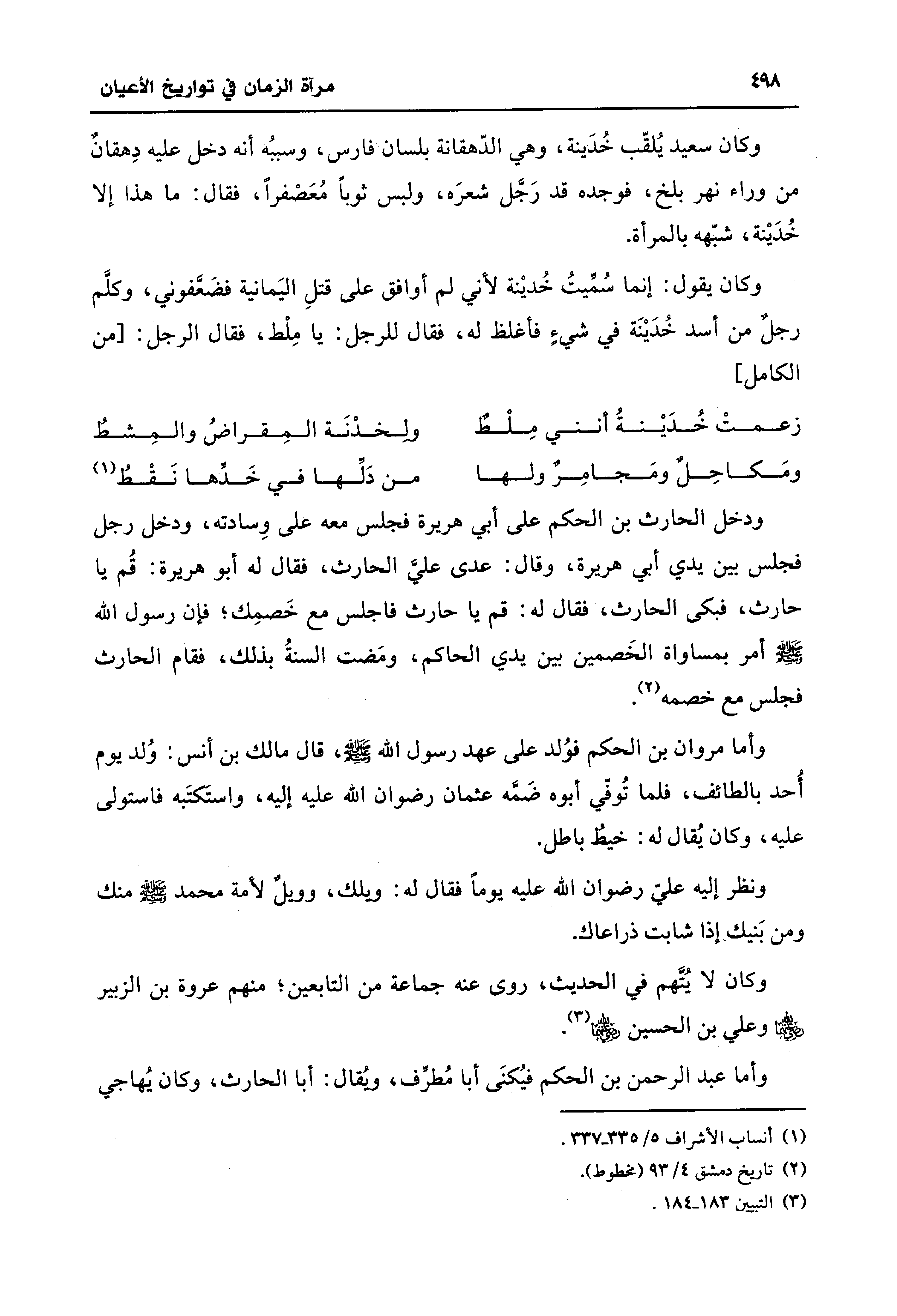 وأمَّا مروان بن الحكم فوُلد على عهد رسول الله - صَلَّى الله عليه وسلم-، قال مالك بن أنس: وُلد يوم أُحد بالطائف، فلما تُوفِّي أبوه ضَمَّه عثمان رضوان الله عليه إليه، واستَكتَبه فاستولى عليه، وكان يُقال له: خيط باطل.