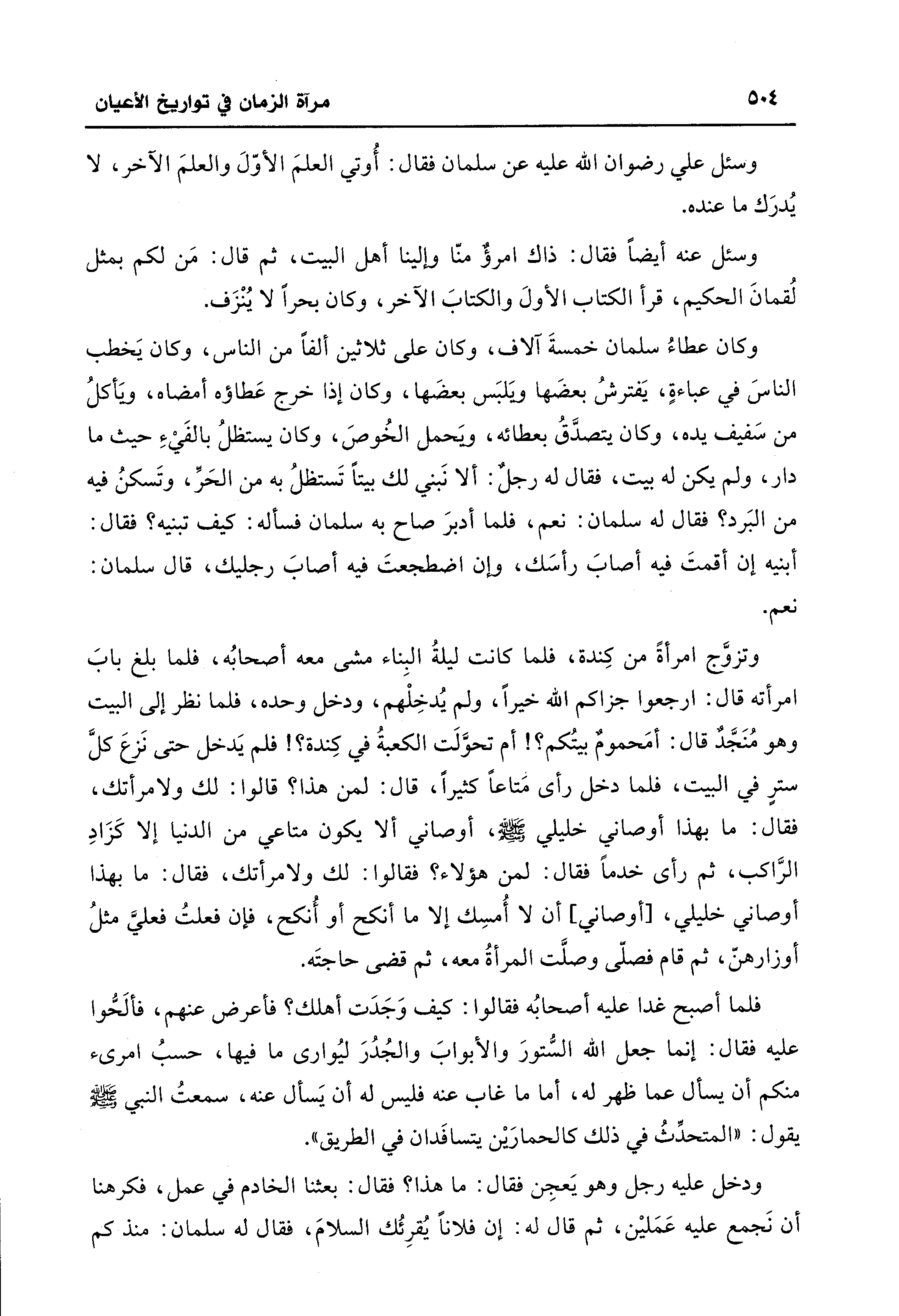 وكان عطاءُ سلمان خمسةَ آلاف، وكان على ثلاثين ألفًا من النَّاس، وكان يَخطب النَّاسَ في عباءة، يَفترشُ بعضَها ويَلبَس بعضَها، وكان إذا خرج عَطاؤه أمضاه، ويَأكلُ من سَفيف يده، وكان يتصدَّقُ بعطائه، ويَحمل الخُوصَ، وكان يستظلُ بالفَيءِ حيث ما دار، ولم يكن له بيت، فقال له رجلٌ: ألا نَبني لك بيتًا تَستظلُ به من الحَرِّ، وتَسكنُ فيه من البَرد؟ فقال له سلمان: نعم، فلما أدبرَ صاح به سلمان فسأله: كيف تبنيه؟ فقال: أبنيه إن أقمتَ فيه أصابَ رأسَك، وإن اضطجعتَ فيه أصابَ رجليك، قال سلمان: نعم.