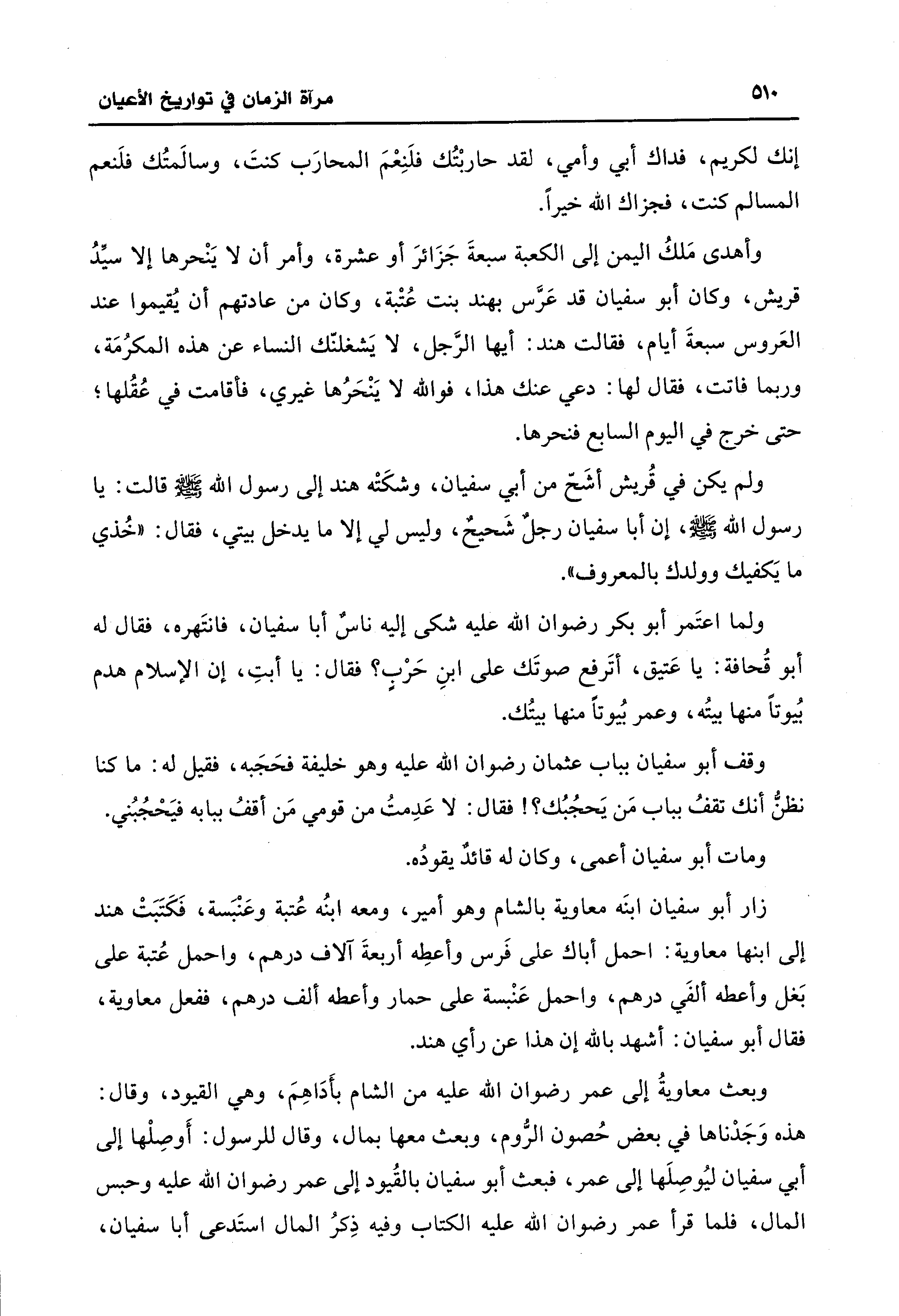 ولم يكن في قُريش أشَحّ من أبي سفيان، وشكَتْه هند إلى رسول الله - صَلَّى الله عليه وسلم - قالت: يا رسول الله - صَلَّى الله عليه وسلم-، إن أبا سفيان رجلٌ شَحيحٌ، وليس لي إلَّا ما يدخل بيتي، فقال: "خُذي ما يَكفيك وولدك بالمعروف".