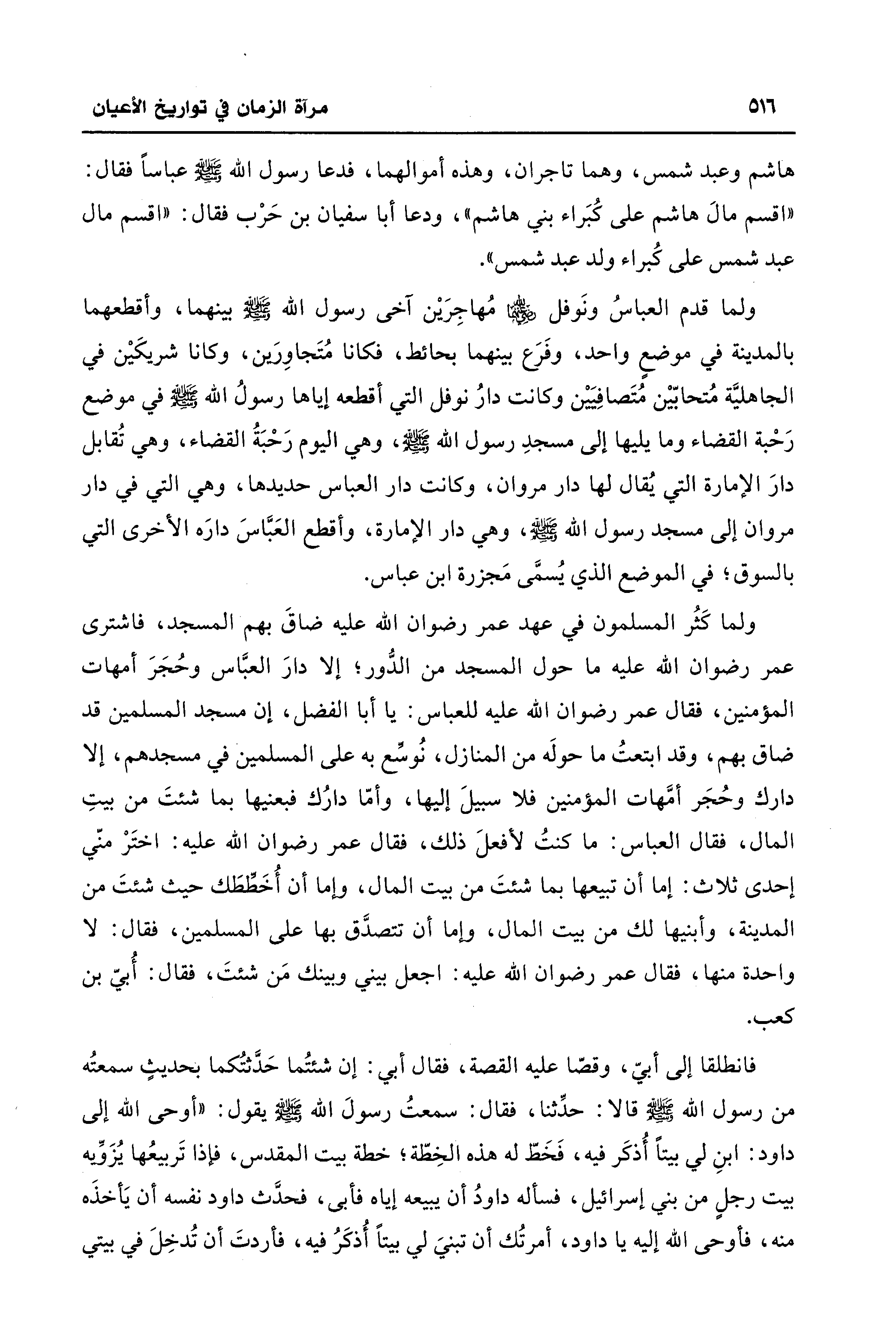 ولما كَثُر المسلمون في عهد عمر رضوان الله عليه ضاقَ بهم المسجد، فاشترى عمر رضوان الله عليه ما حول المسجد من الدُّور؛ إلَّا دارَ العبَّاس وحُجَرَ أمهات المؤمنين، فقال عمر رضوان الله عليه للعباس: يا أبا الفضل، إن مسجد المسلمين قد ضاق بهم، وقد ابتعتُ ما حولَه من المنازل، نُوسِّع به على المسلمين في مسجدهم، إلَّا دارك وحُجَر أمَّهات المؤمنين فلا سبيلَ إليها، وأمّا دارُك فبعنيها بما شئتَ من بيتِ المال، فقال العباس: ما كنتُ لأفعلَ ذلك، فقال عمر رضوان الله عليه: اختَرْ منّي إحدى ثلاث: إما أن تبيعها بما شئتَ من بيت المال، وإما أن أُخَطِّطَك حيث شئتَ من المدينة، وأبنيها لك من بيت المال، وإما أن تتصدَّق بها على المسلمين، فقال: لا واحدة منها، فقال عمر رضوان الله عليه: اجعل بيني وبينك مَن شئتَ، فقال: أُبيّ بن كعب.