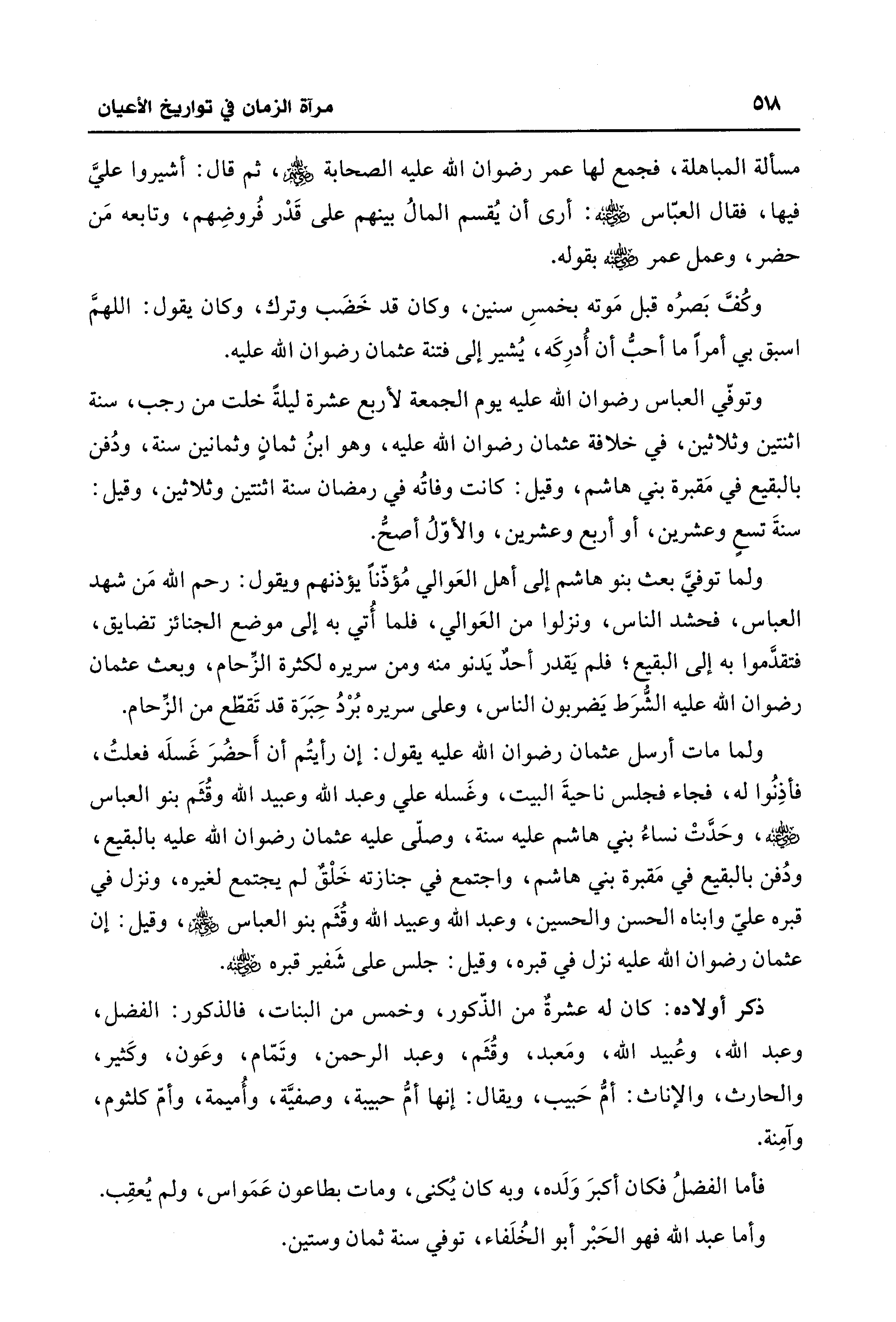 ولما توفيَّ بعث بنو هاشم إلى أهل العَوالي مُؤذّنًا يؤذنهم ويقول: رحم الله مَن شهد العباس، فحشد النَّاس، ونزلوا من العَوالي، فلما أُتي به إلى موضع الجنائز تضايق، فتقدَّموا به إلى البقيع؛ فلم يَقدر أحدٌ يَدنو منه ومن سريره لكثرة الزِّحام، وبعث عثمان رضوان الله عليه الشُّرَط يَضربون النَّاس، وعلى سريره بُرْدُ حِبَرَة قد تَقطّع من الزِّحام.