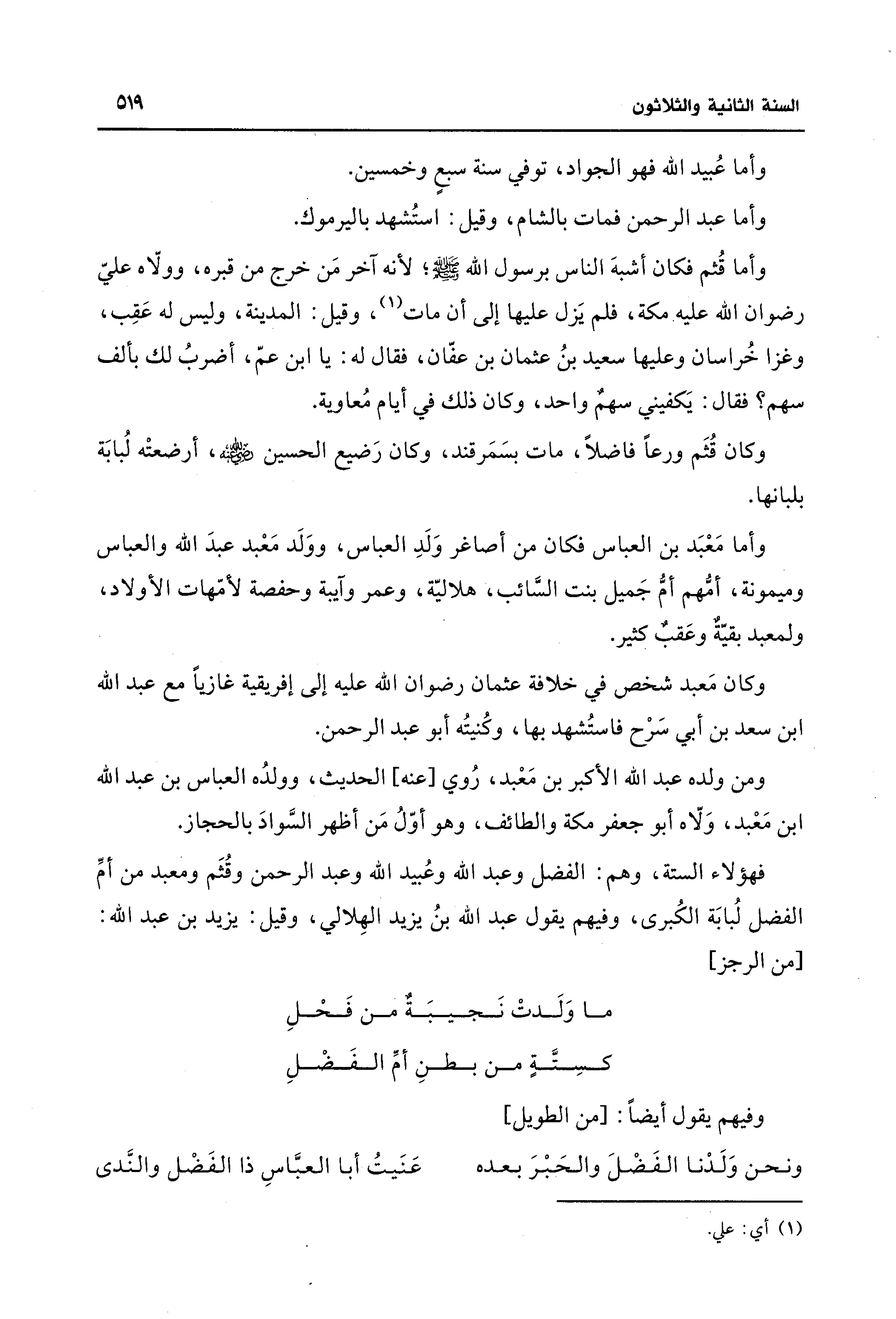 فهؤلاء الستة، وهم: الفضل وعبد الله وعُبيد الله وعبد الرحمن وقُثَم ومعبد من أمِّ الفضل لُبابَة الكُبرى، وفيهم يقول عبد الله بنُ يزيد الهِلالي، وقيل: يزيد بن عبد الله: [من الرجز]