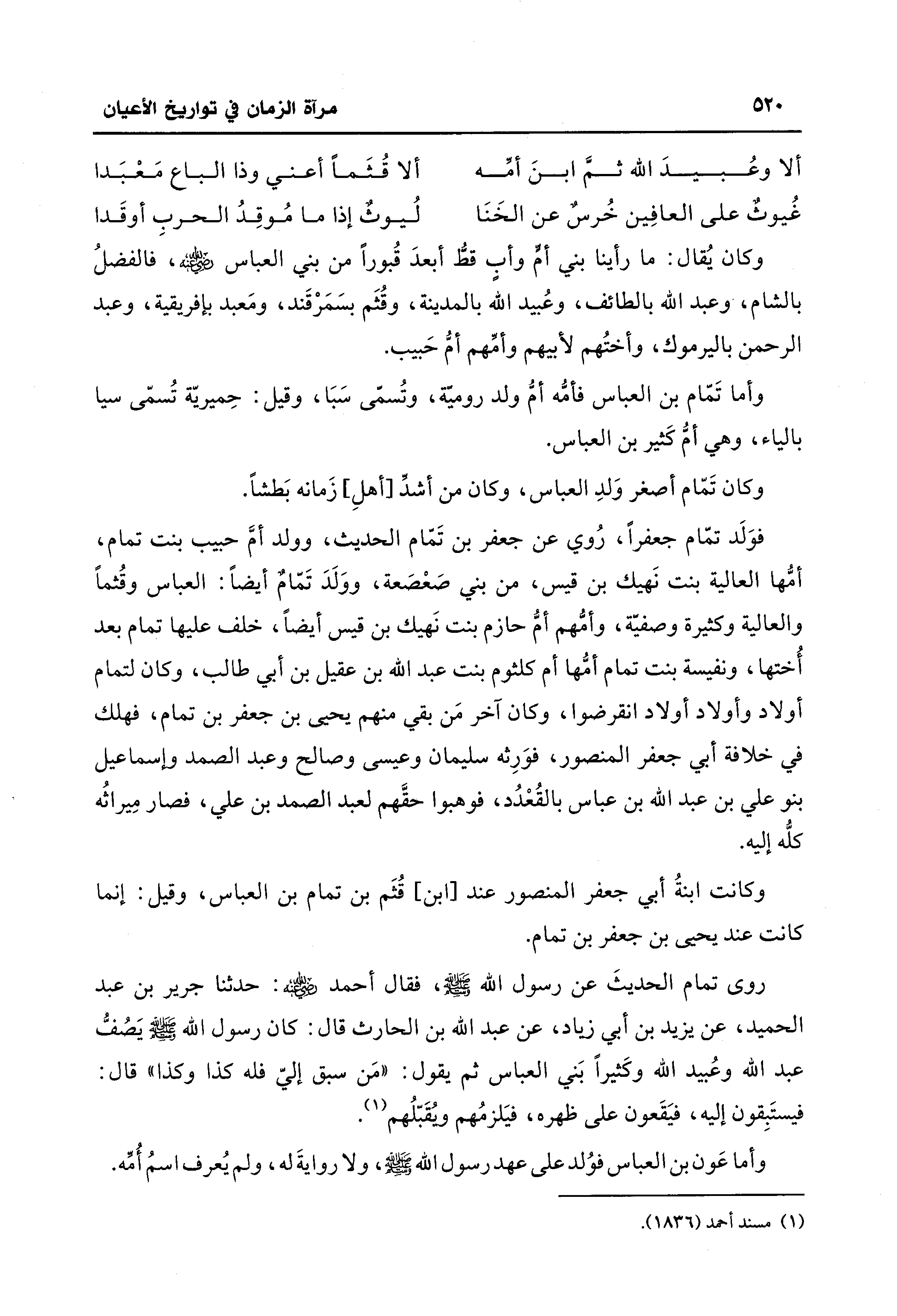 وكانت ابنةُ أبي جعفر المنصور عند [ابن] قُثَم بن تمام بن العباس، وقيل: إنَّما كانت عند يحيى بن جعفر بن تمام.