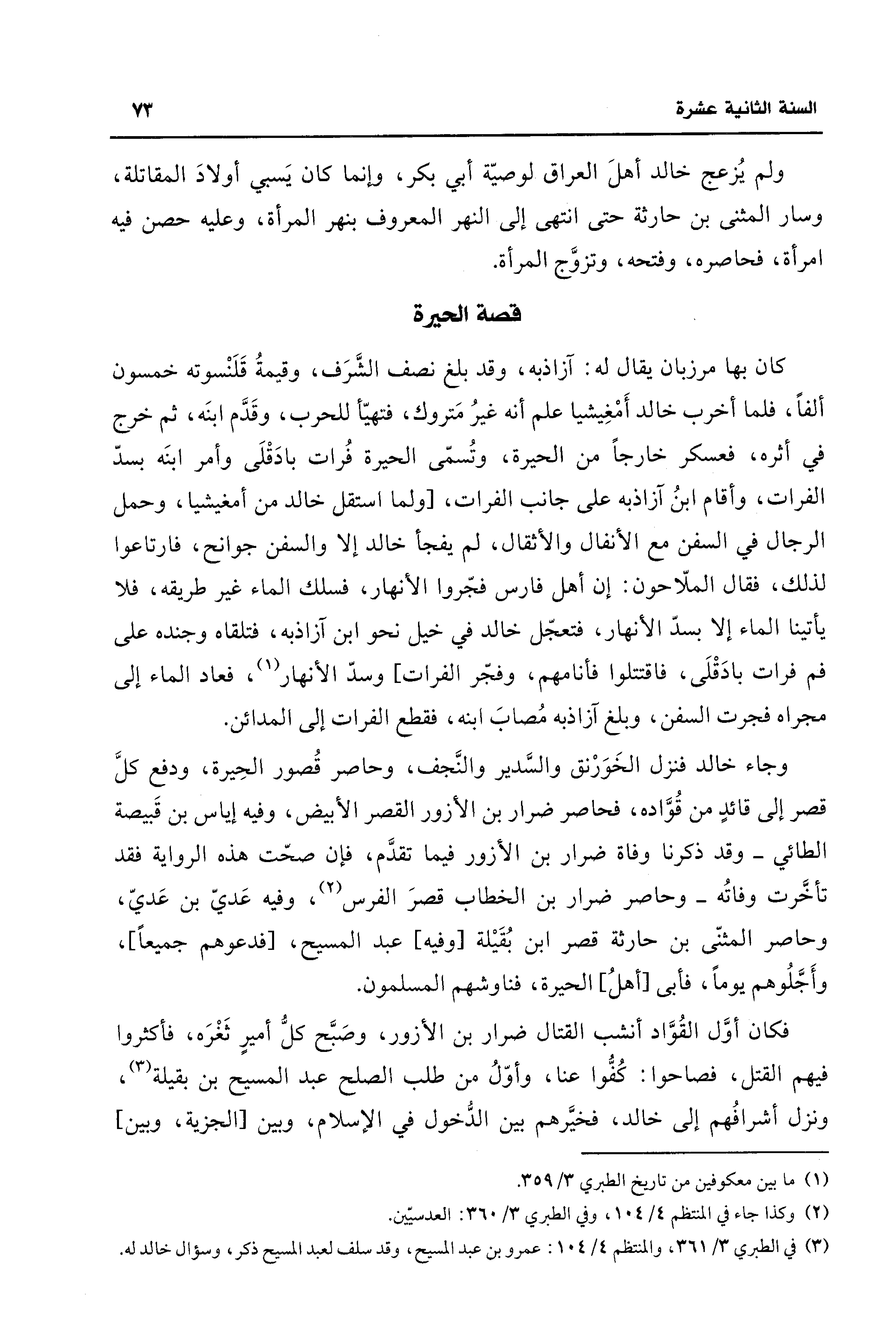 وجاء خالد فنزل الخَوَرْنق والسَّدير والنَّجف، وحاصر قُصور الحِيرة، ودفع كلَّ قصر إلى قائدٍ من قُوَّاده، فحاصر ضرار بن الأزور القصر الأبيض، وفيه إياس بن قَبيصة الطائي - وقد ذكرنا وفاة ضرار بن الأزور فيما تقدَّم، فإن صحّت هذه الرواية فقد تأخَّرت وفاتُه - وحاصر ضرار بن الخطاب قصرَ الفرس (¬2)، وفيه عَديّ بن عَديّ، وحاصر المثنّى بن حارثة قصر ابن بُقَيْلة [وفيه] عبد المسيح، [فدعوهم جميعًا] , وأَجَّلُوهم يومًا، فأبى [أهلُ] الحيرة، فناوشهم المسلمون.