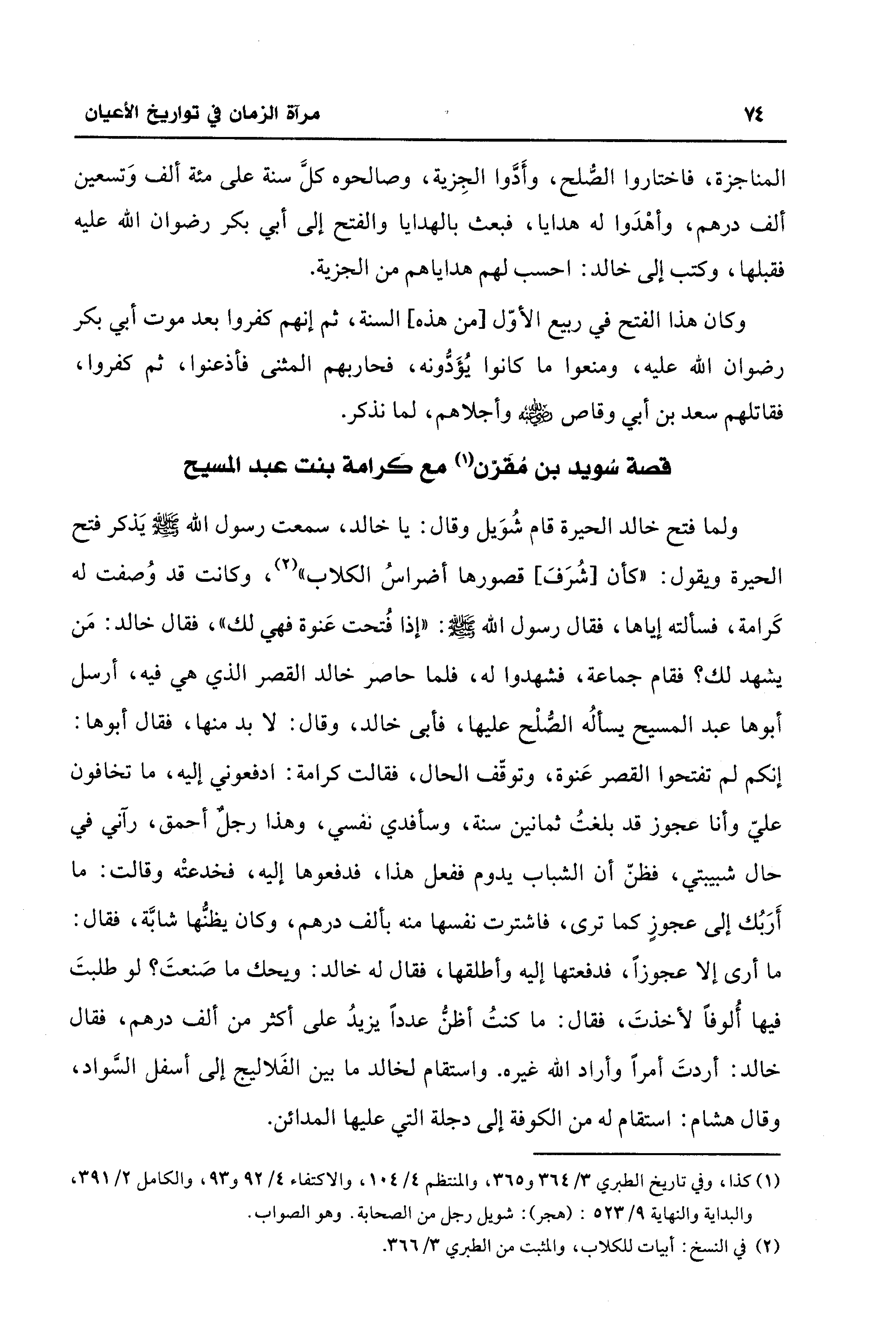 وكان هذا الفتح في ربيع الأوّل [من هذه] السنة، ثم إنهم كفروا بعد موت أبي بكر رضوان الله عليه، ومنعوا ما كانوا يُؤَدُّونه، فحاربهم المثنى فأذعنوا، ثم كفروا، فقاتلهم سعد بن أبي وقاص - رضي الله عنه - وأجلاهم، لما نذكر.