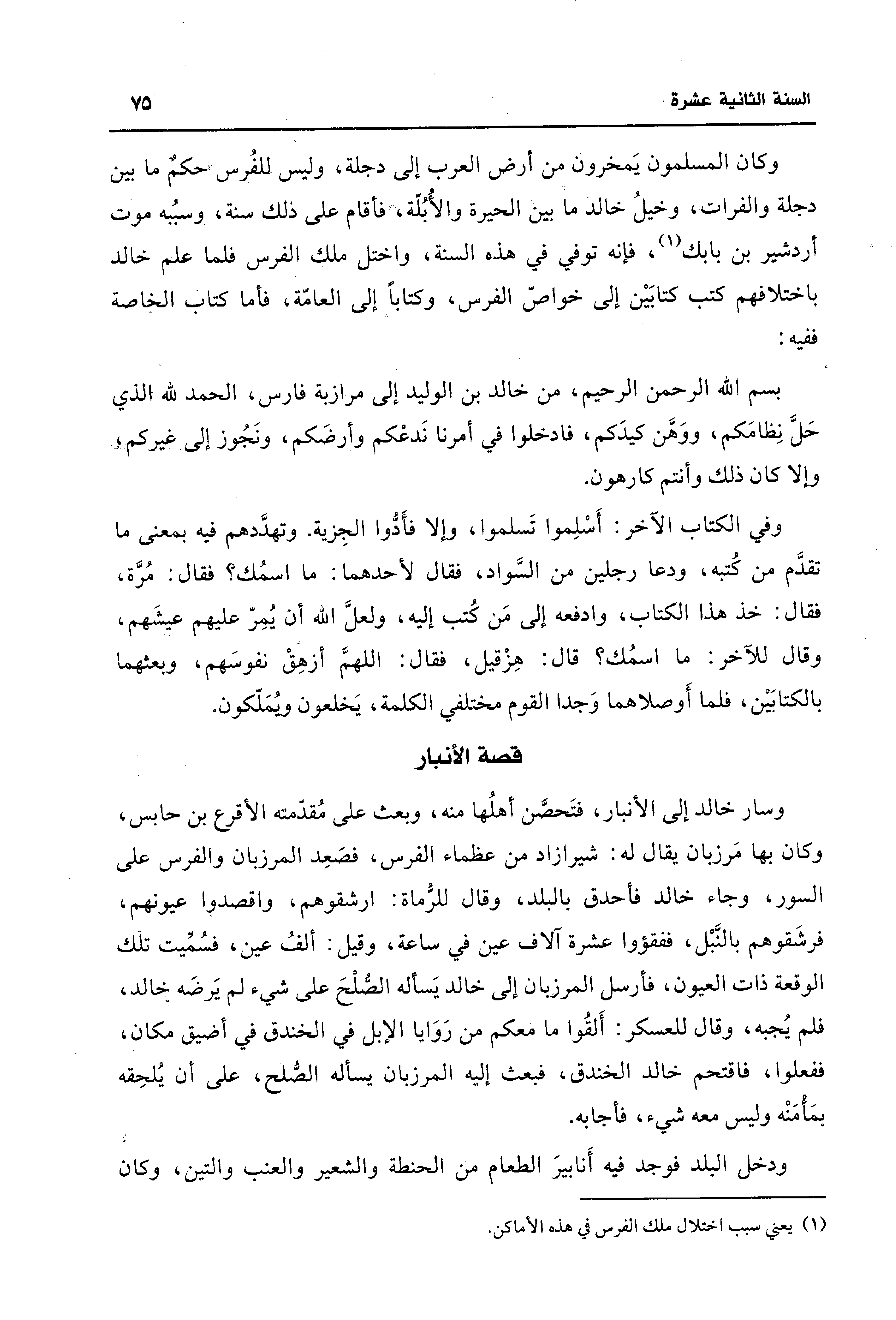 وكان المسلمون يَمخرون من أرض العرب إلى دجلة، وليس للفُرس حكمٌ ما بين دجلة والفرات، وخيلُ خالد ما بين الحيرة والأُبُلّة، فأقام على ذلك سنة، وسبُبه موت أردشير بن بابك (¬1)، فإنه توفي في هذه السنة، واختل ملك الفرس فلما علم خالد باختلافهم كتب كتابَيْن إلى خواصّ الفرس، وكتابًا إلى العامّة، فأما كتاب الخاصة ففيه: