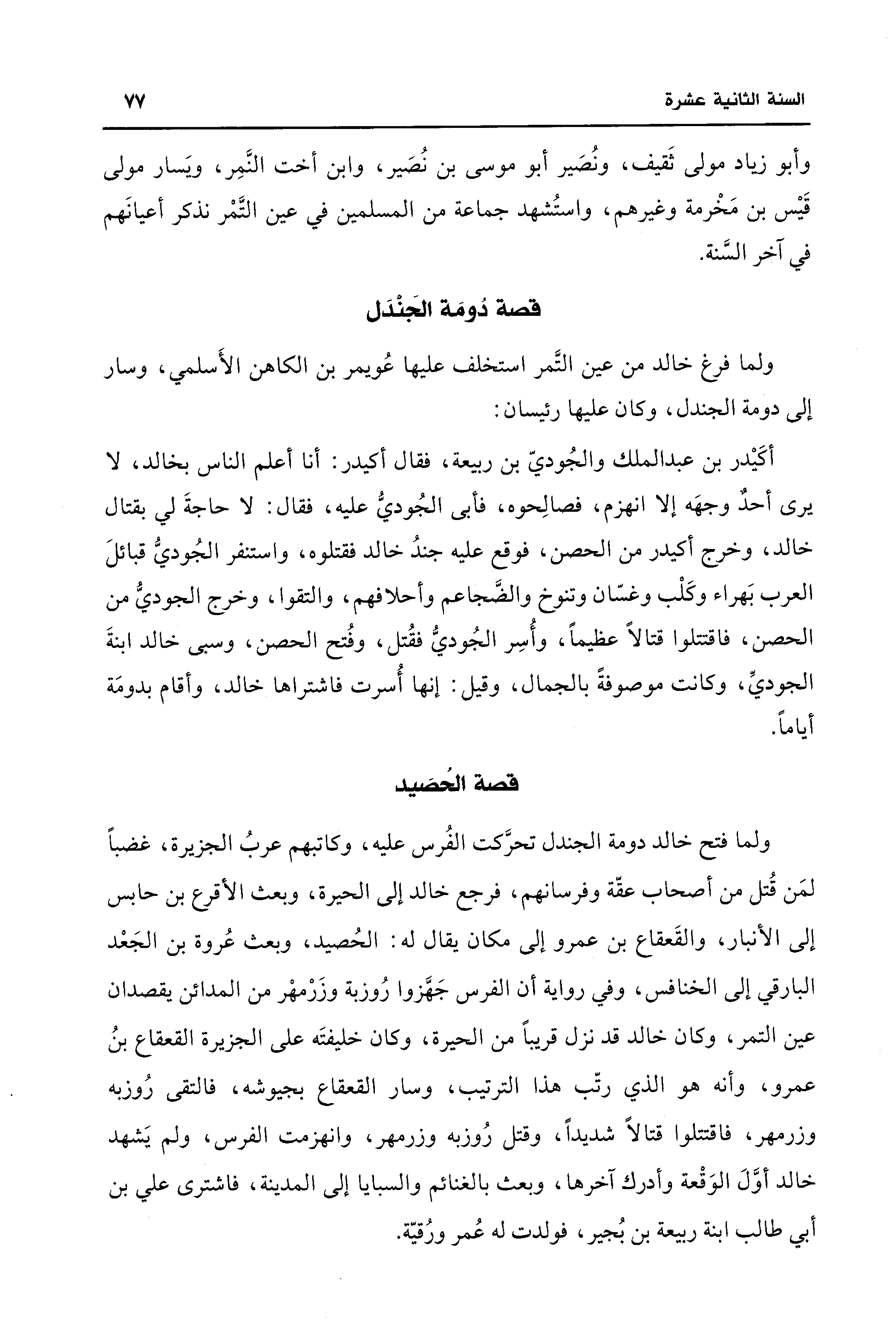 وأبو زياد مولى ثَقيف، ونُصَير أبو موسى بن نُصَير، وابن أخت النَّمِر، ويَسار مولى قَيْس بن مَخْرمة وغيرهم، واستُشهد جماعة من المسلمين في عين التَّمْر نذكر أعيانَهم في آخر السَّنة.