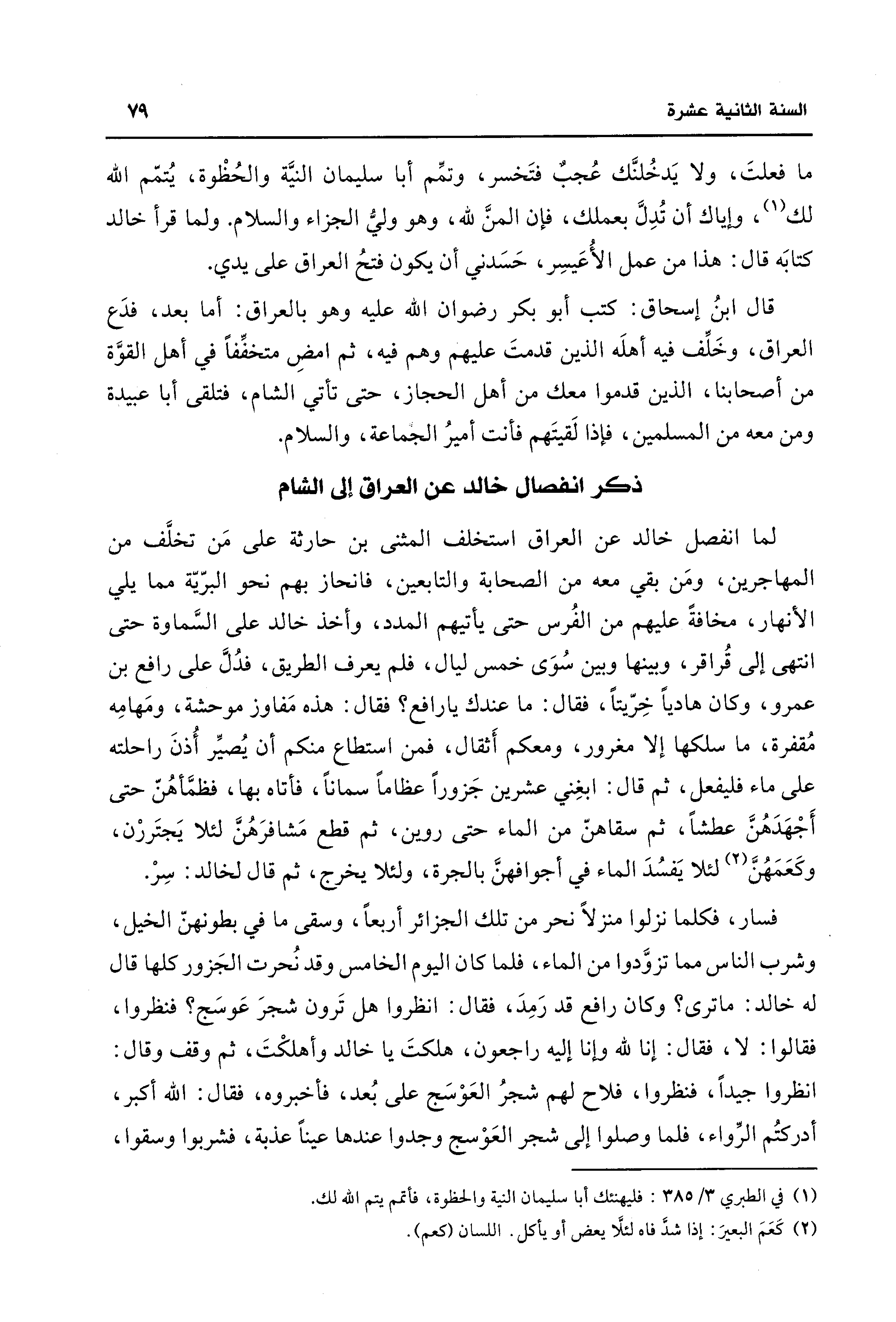 قال ابنُ إسحاق: كتب أبو بكر رضوان الله عليه وهو بالعراق: أما بعد، فدَع العراق، وخَلِّف فيه أهلَه الذين قدمتَ عليهم وهم فيه، ثم امضِ متخفِّفًا في أهل القوَّة من أصحابنا، الذين قدموا معك من أهل الحجاز، حتى تأتي الشام، فتلقى أبا عبيدة ومن معه من المسلمين، فإذا لَقيتَهم فأنت أميرُ الجماعة، والسلام.