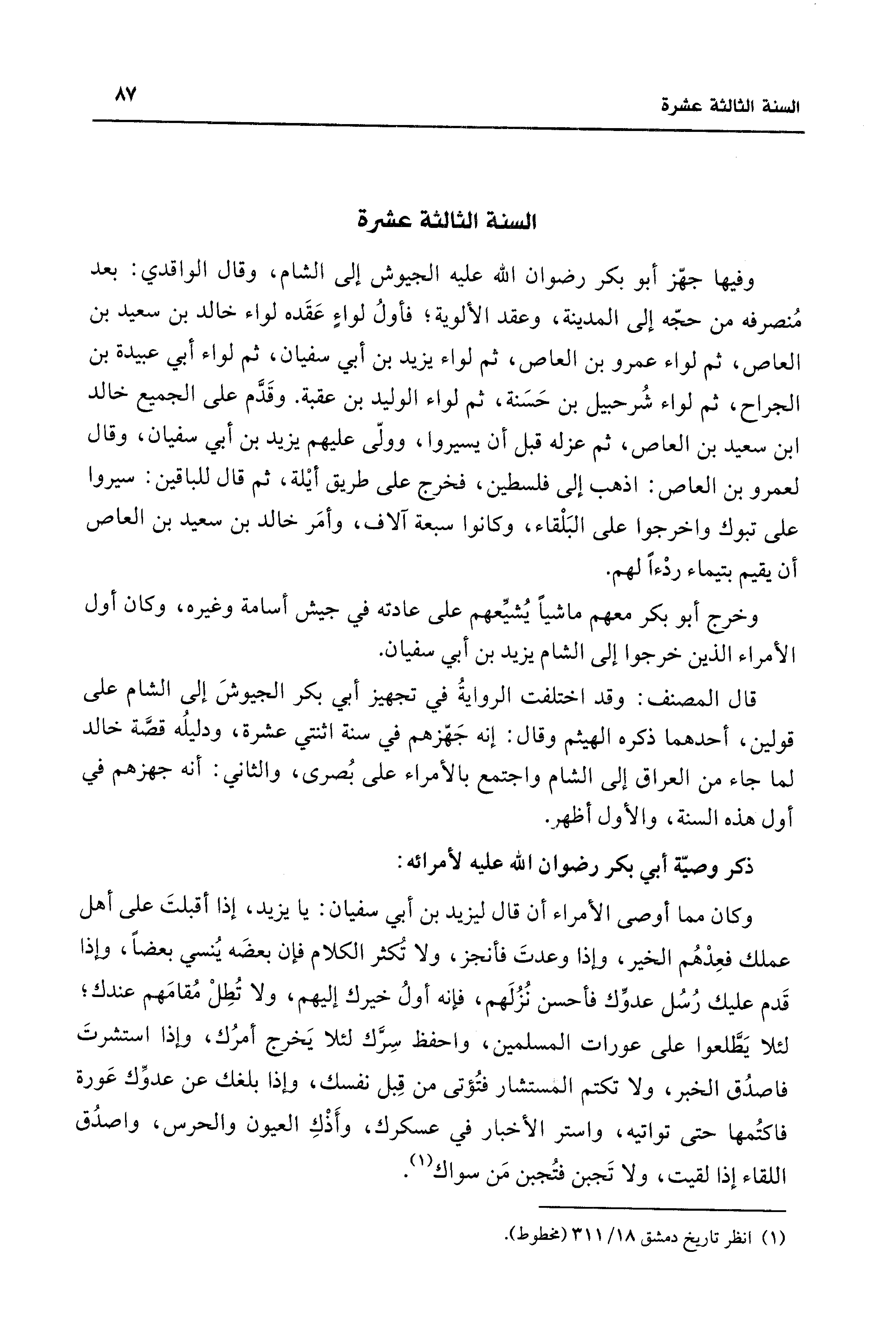 قال المصنف: وقد اختلفت الروايةُ في تجهيز أبي بكر الجيوشَ إلى الشام على قولين، أحدهما ذكره الهيثم وقال: إنه جَهّزهم في سنة اثنتي عشرة، ودليلُه قصَّة خالد لما جاء من العراق إلى الشام واجتمع بالأمراء على بُصرى، والثاني: أنه جهزهم في أول هذه السنة، والأول أظهر.