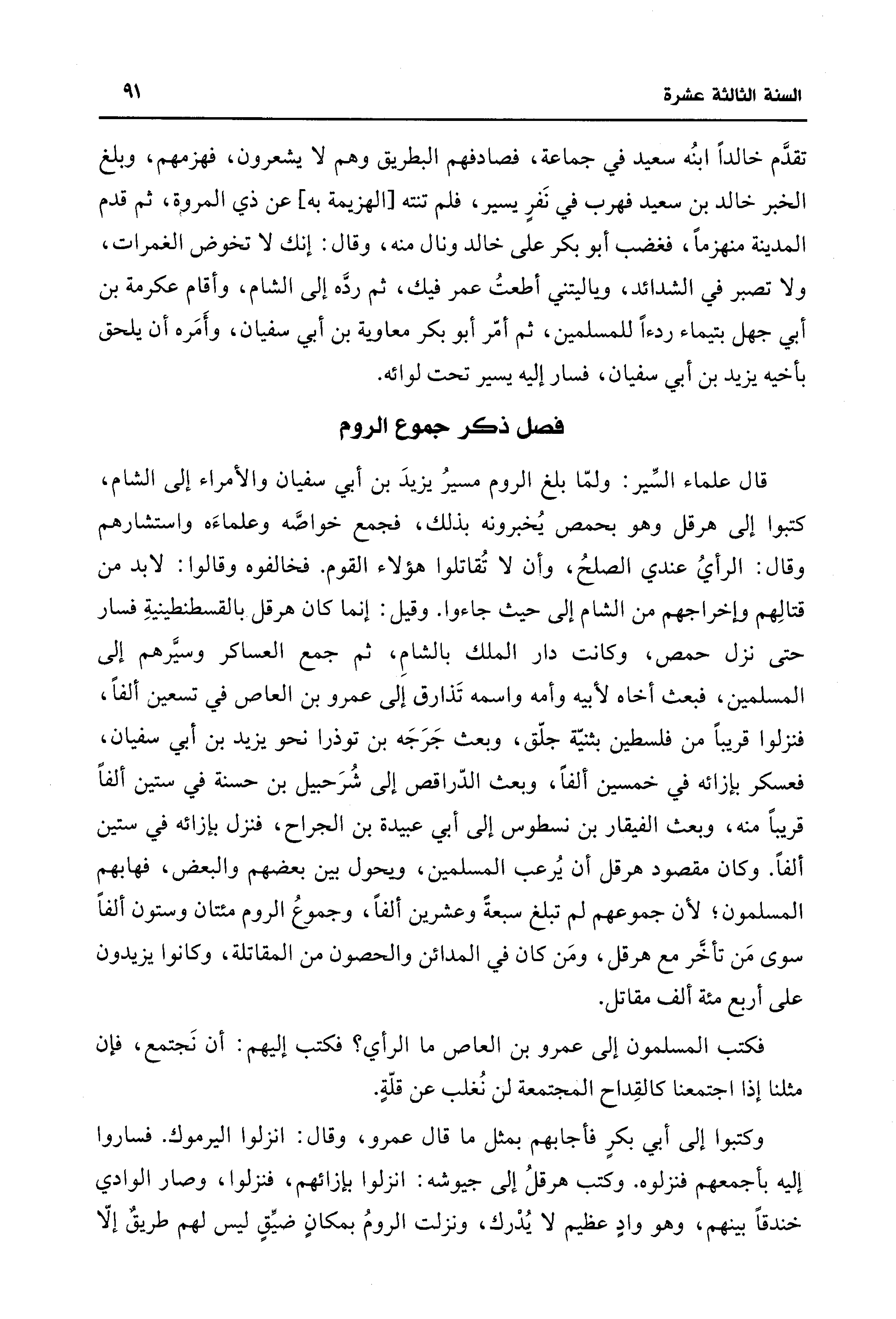 وكتبوا إلى أبي بكرٍ فأجابهم بمثل ما قال عمرو، وقال: انزلوا اليرموك. فساروا إليه بأجمعهم فنزلوه. وكتب هرقلُ إلى جيوشه: انزلوا بإزائهم، فنزلوا، وصار الوادي خندقًا بينهم، وهو وادٍ عظيم لا يُدْرك، ونزلت الرومُ بمكانٍ ضيِّقٍ ليس لهم طريقٌ إلَّا