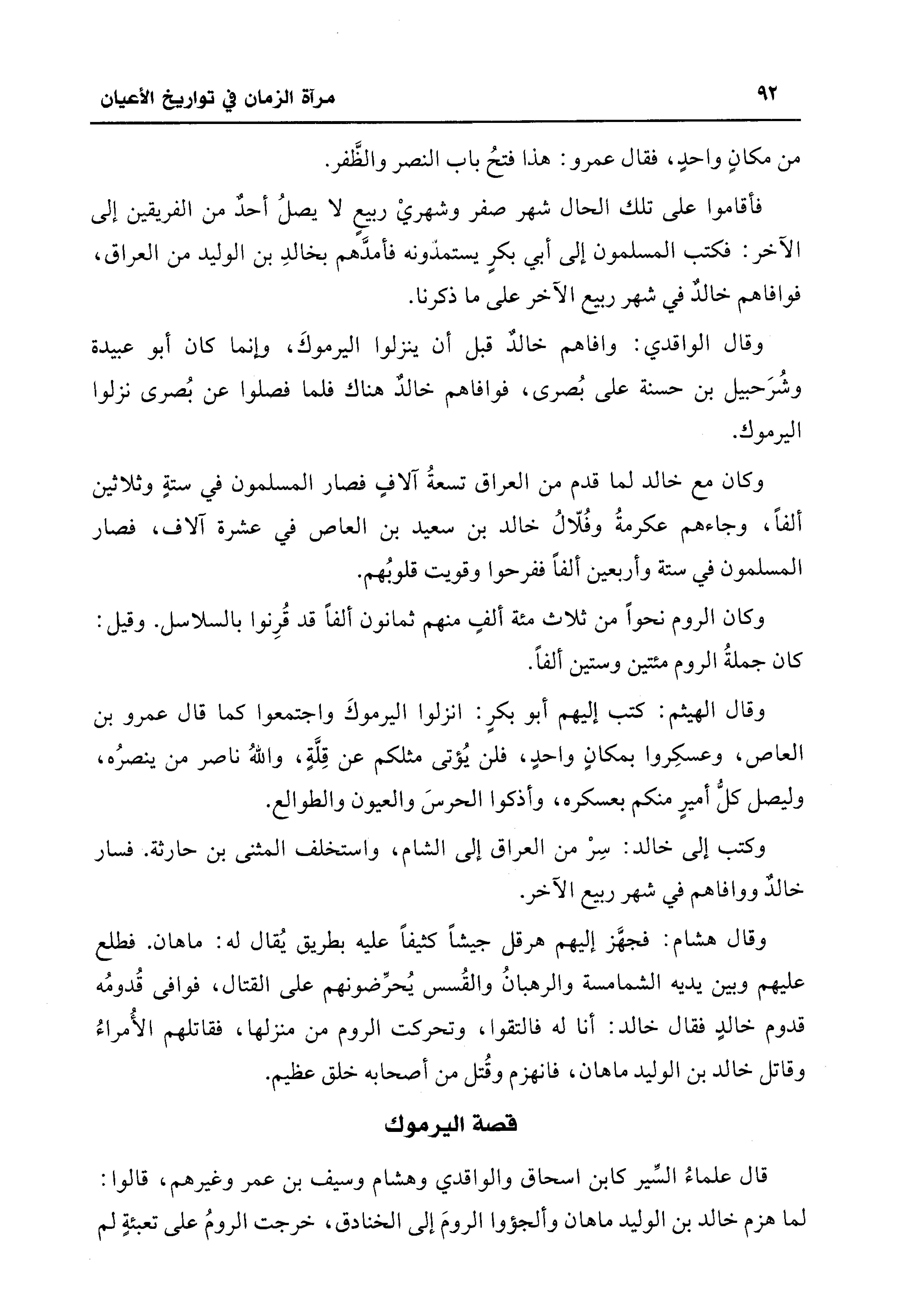 وقال الهيثم: كتب إليهم أبو بكرٍ: انزلوا اليرموكَ واجتمعوا كما قال عمرو بن العاص، وعسكِروا بمكانٍ واحدٍ، فلن يُؤتى مثلكم عن قِلَّةٍ، واللَّهُ ناصر من ينصرُه، وليصل كلُّ أميرٍ منكم بعسكره، وأذكوا الحرسَ والعيون والطوالع.