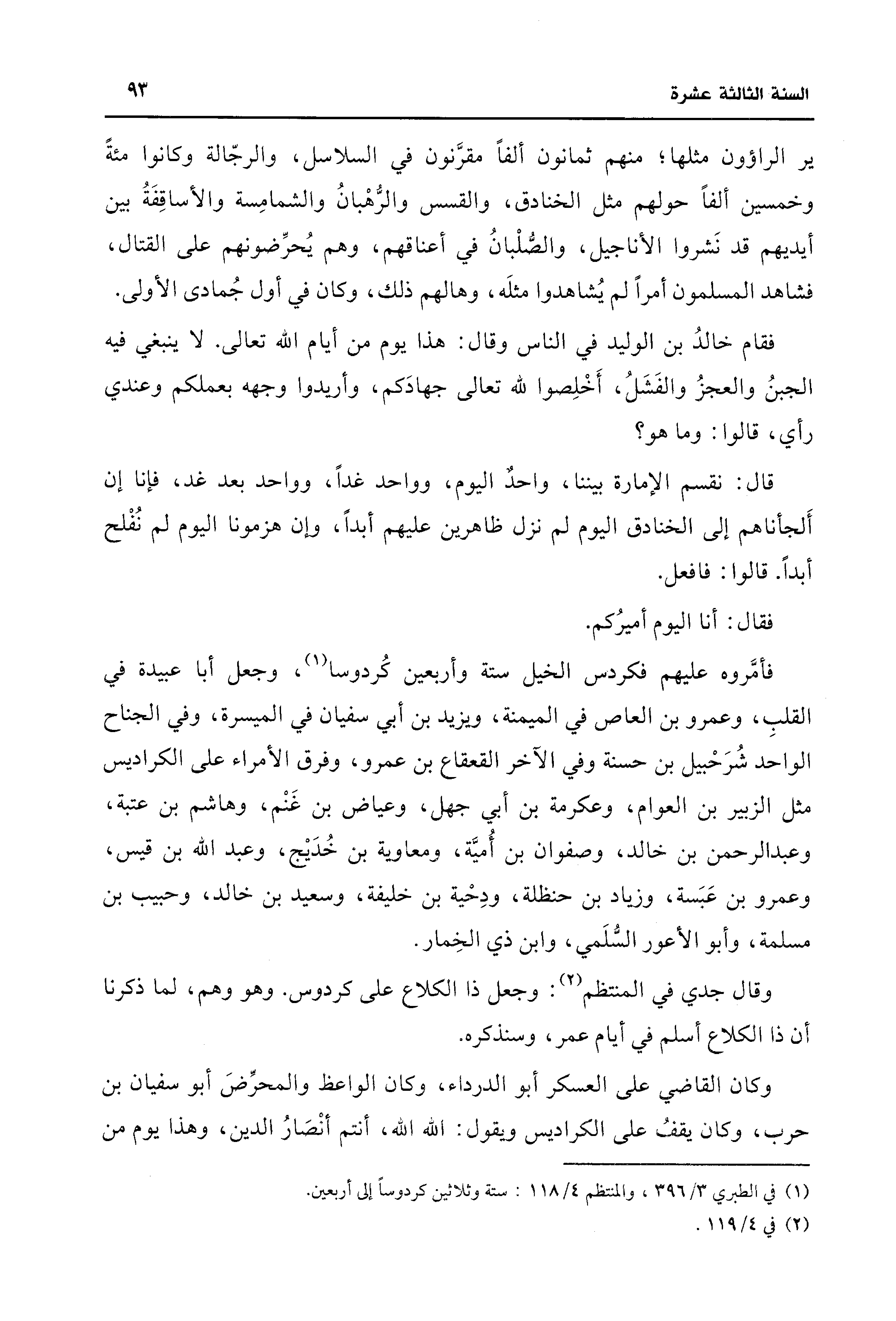 فأمَّروه عليهم فكردس الخيل ستة وأربعين كُردوسا (¬1)، وجعل أبا عبيدة في القلبِ، وعمرو بن العاص في الميمنة، ويزيد بن أبي سفيان في الميسرة، وفي الجناح الواحد شُرَحْبيل بن حسنة وفي الآخر القعقاع بن عمرو، وفرق الأمراء على الكراديس مثل الزبير بن العوام، وعكرمة بن أبي جهل، وعياض بن غَنْم، وهاشم بن عتبة، وعبد الرحمن بن خالد، وصفوان بن أُمية، ومعاوية بن خُدَيْج، وعبد اللَّه بن قيس، وعمرو بن عَبَسة، وزياد بن حنظلة، ودِحْية بن خليفة، وسعيد بن خالد، وحبيب بن مسلمة، وأبو الأعور السُّلَمي، وابن ذي الخِمار.