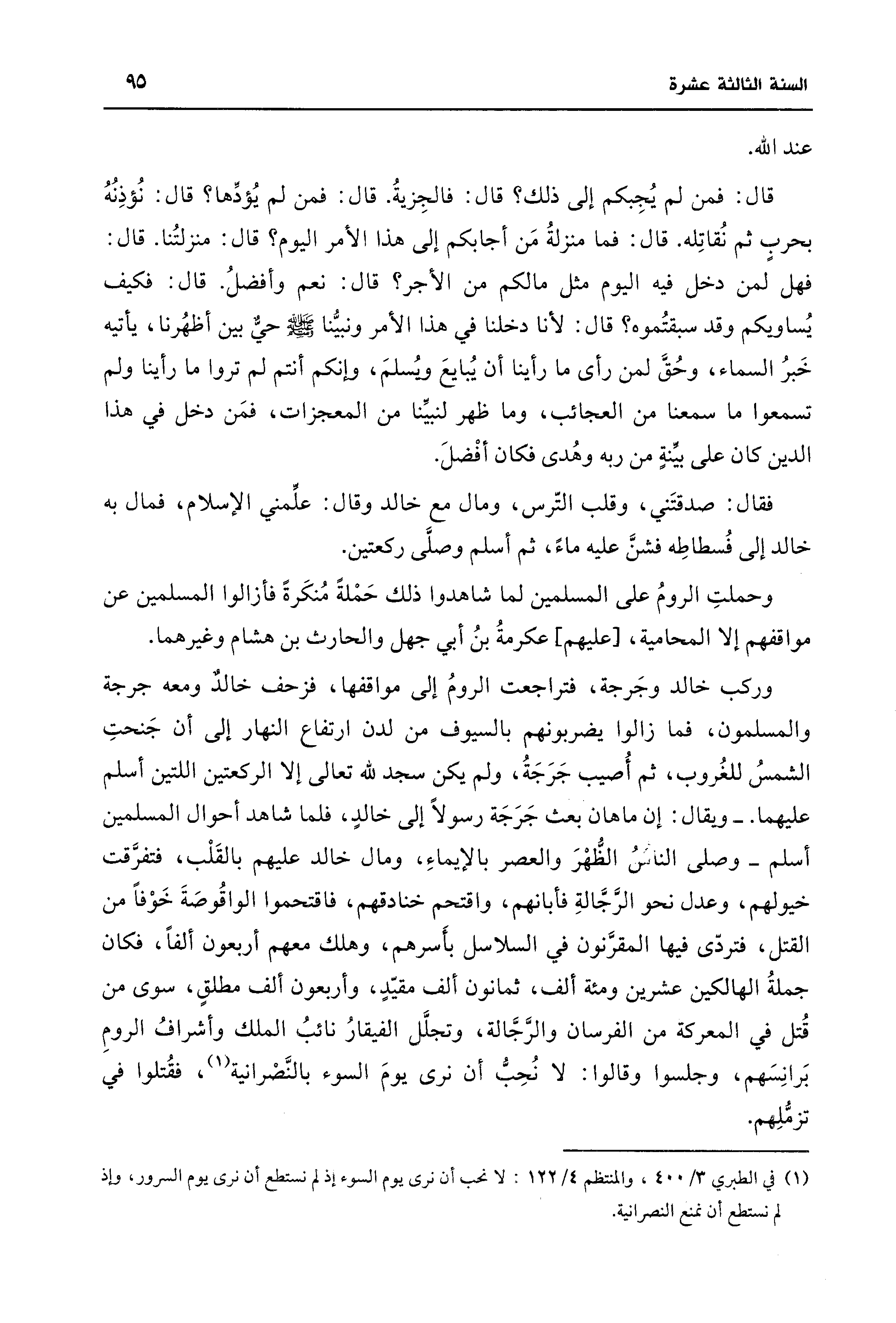 قال: فمن لم يُجِبكم إلى ذلك؟ قال فالجِزيةُ. قال: فمن لم يُؤدِّها؟ قال: نُؤذِنُهُ بحربٍ ثم نُقاتِله. قال: فما منزلةُ مَن أجابكم إلى هذا الأمر اليوم؟ قال: منزلتُنا. قال: فهل لمن دخل فيه اليوم مثل مالكم من الأجر؟ قال: نعم وأفضلُ. قال: فكيف يُساويكم وقد سبقتُموه؟ قال: لأنا دخلنا في هذا الأمر ونبيُّنا -صلى اللَّه عليه وسلم- حيٌّ بين أظهُرنا، يأتيه خَبرُ السماء، وحُقَّ لمن رأى ما رأينا أن يُبايعَ ويُسلمَ، وإنكم أنتم لم تروا ما رأينا ولم تسمعوا ما سمعنا من العجائب، وما ظهر لنبينا من المعجزات، فمَن دخل في هذا الدين كان على بينةٍ من ربه وهُدى فكان أفْضلَ.